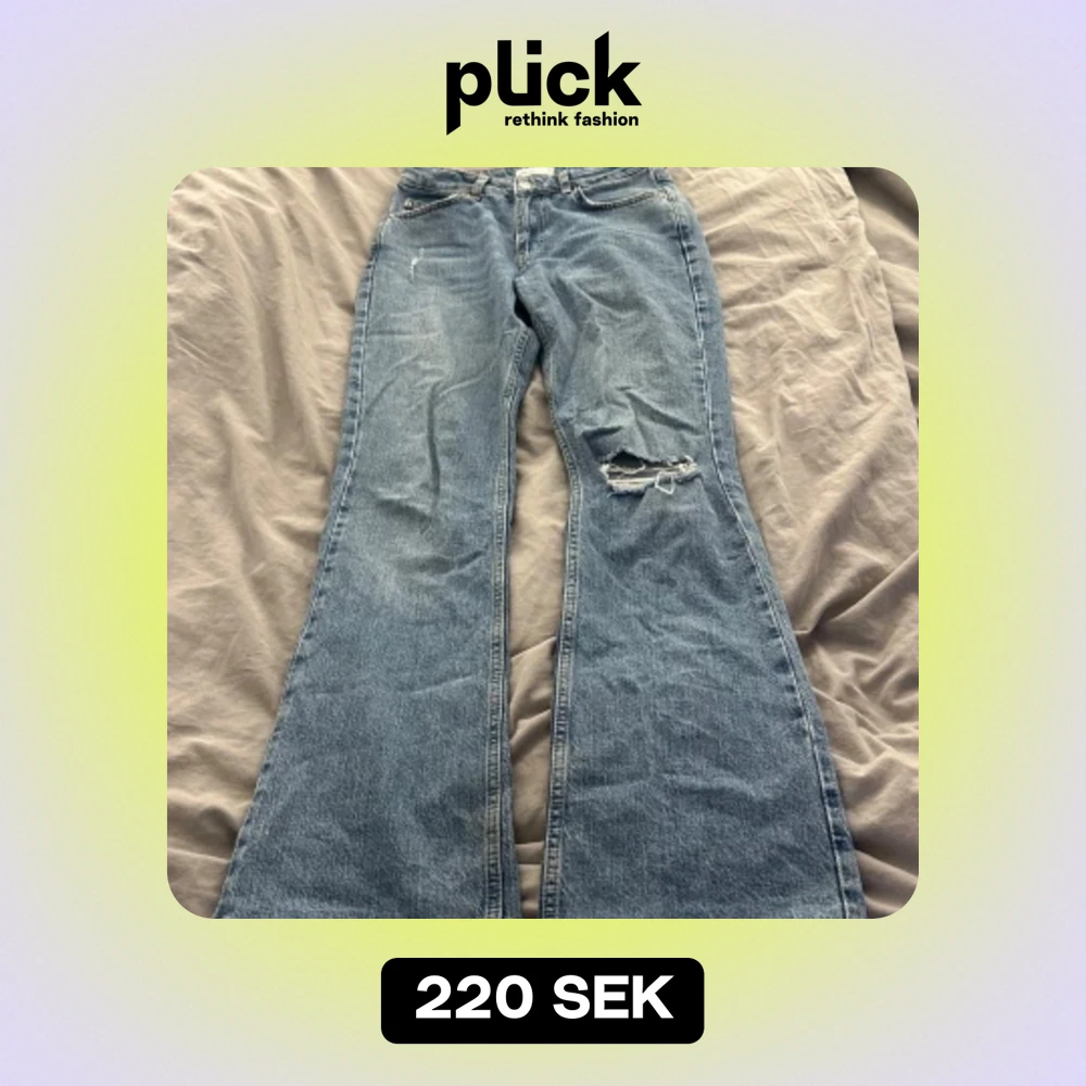 Säljer ett par snygga blå jeans från Perfect Jeans i storlek S. De har en cool slitning på ena benet och en klassisk femficksdesign. Jeansen har en bootcut-stil som ger en retro vibe. Perfekta för en avslappnad look! ”Har trampat lite på de”