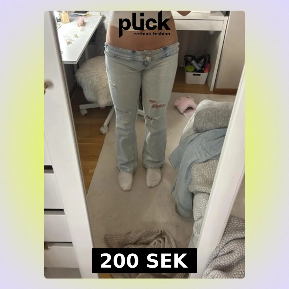 Säljer ett par väldigt lågmidjade ljusblå bootcut jeans med slitna detaljer och hål på benen. Jeansen har låg midja och klassisk femficksdesign. Perfekta för dig som gillar en avslappnad och trendig look. Personen i bilden är 171