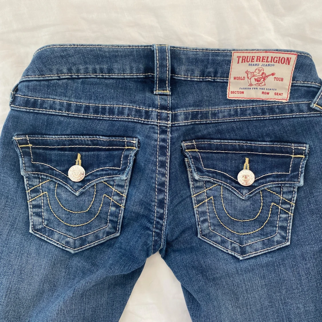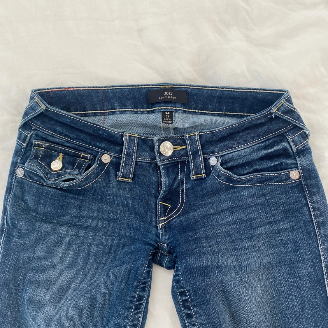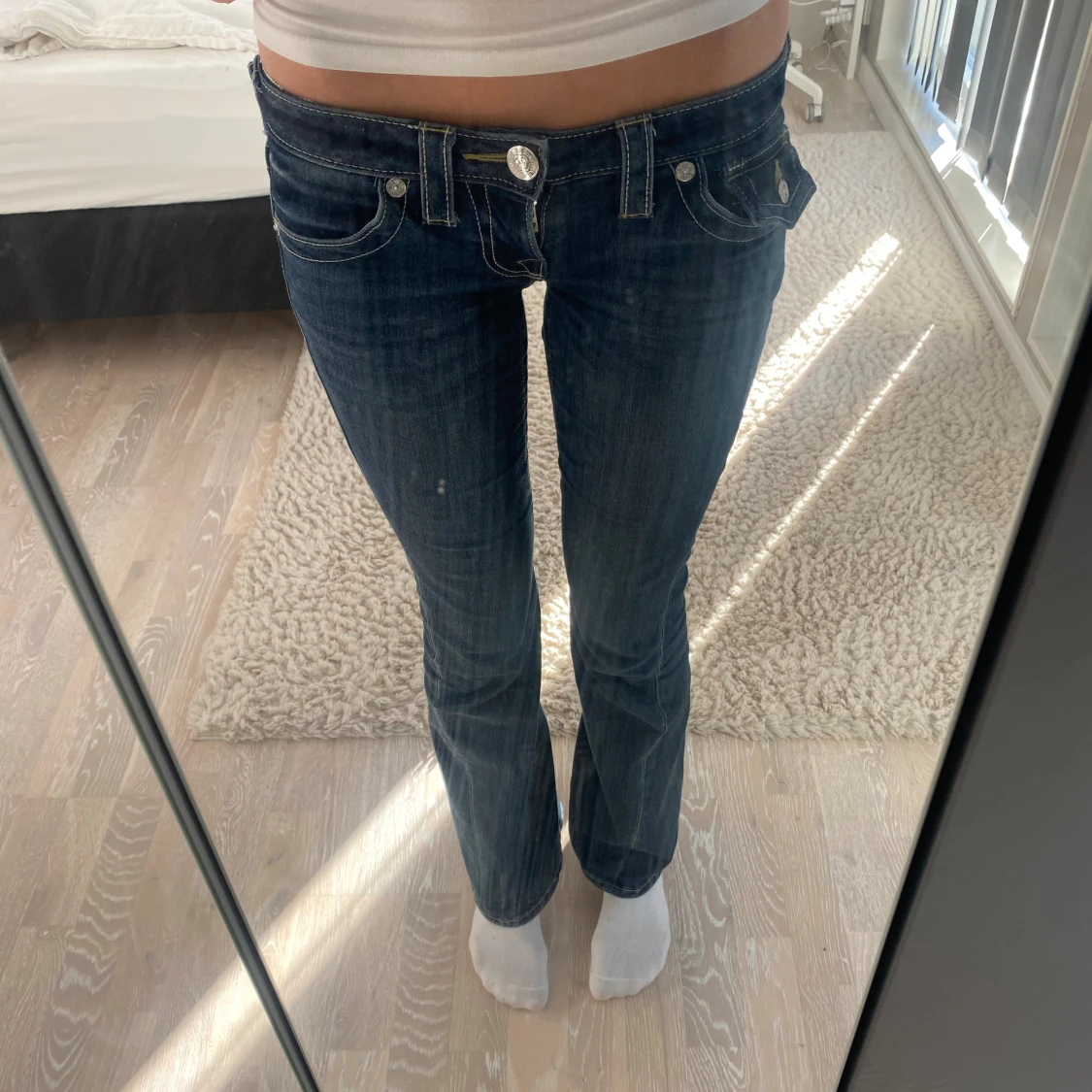 Säljer ett par blå True Religion Joey jeans med låg midja och bootcut, då jag inte får användning av dom längre. Jag köpte jeansen för 2 månader sen så dom ser helt nya ut och är inte alls slitna. Jag är 172 och dom når precis ner till marken. 85cm innerbens mått.