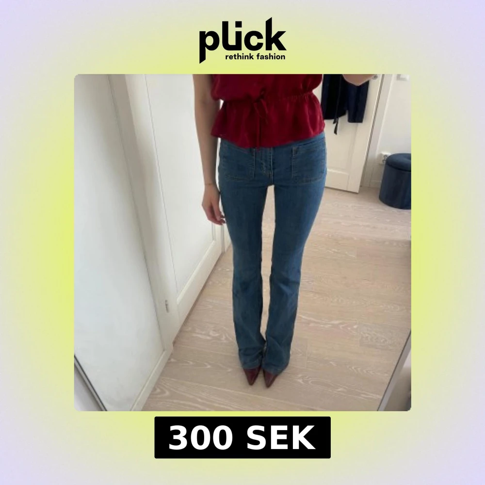 Sjukt snygga och väldigt långa bootcut jeans, jag är 175 och på bilden har jag 9 cm klackar men funkar även om man har lite högre sneakers😍 sjukt snygga detaljer och sparsamt använda men lite slitna längst ned på baksidan, köpta secondhand och står tyvärr inget märke i