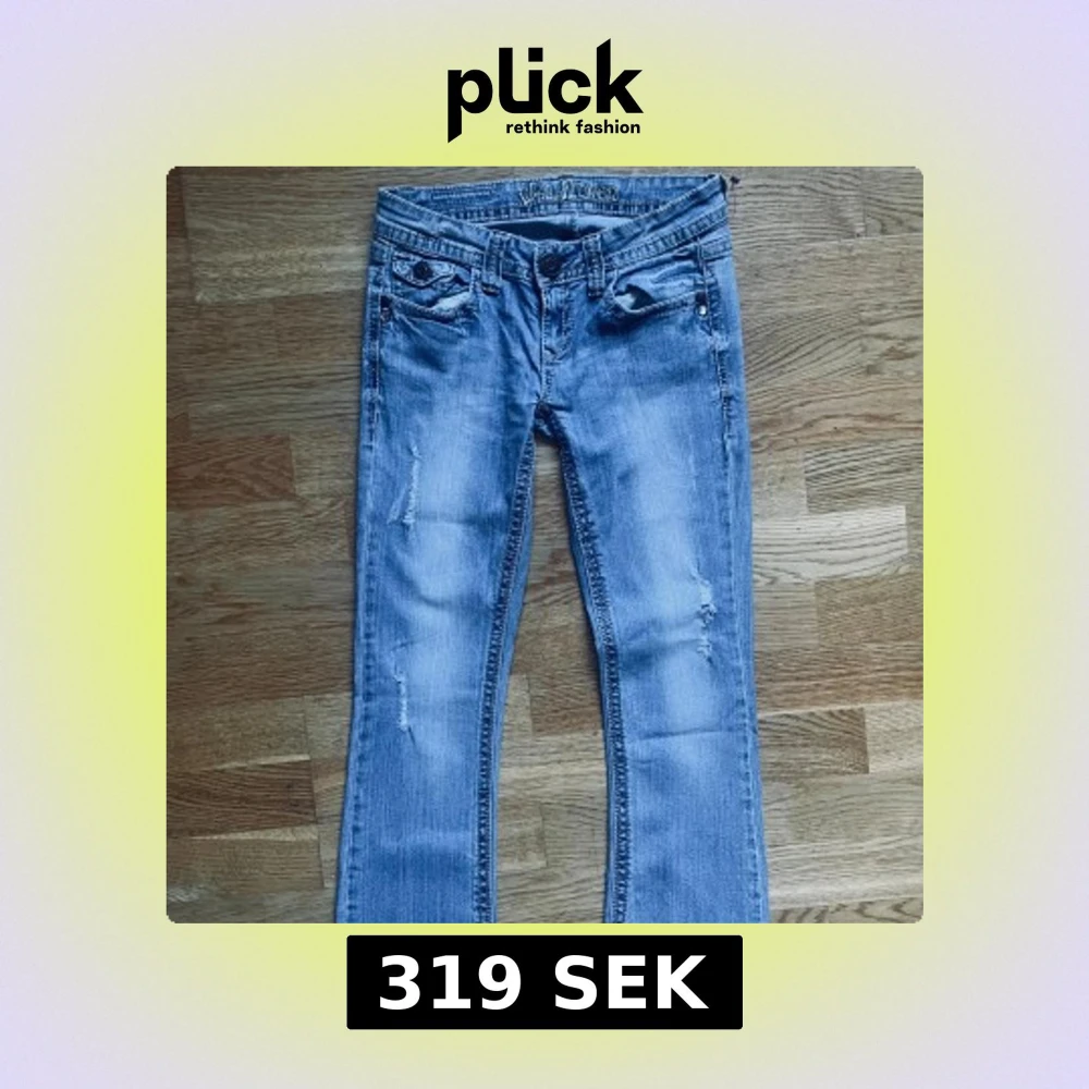 Ljusblå jeans från Wallflower med bootcut passform och slitna detaljer framtill. Snygga broderade bakfickor med knappar och klassisk femficksdesign. Jeansen är tillverkade i denim och har en cool, avslappnad vibe. Storlek Xs yttersömn 94cm, innersömn 70cm, midjebredd 34cm)