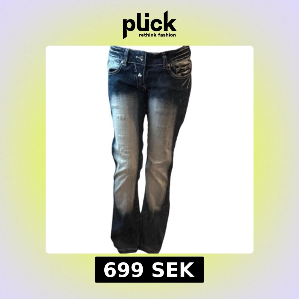Säljer ett par bootcut lågmidjade blå jeansbyxor från Blue Queen med broderade vita detaljer på bakfickorna och insidan av linningen. Byxorna har en bootcut-stil och ljusa slitningar framtill och baktill för en cool look. Lite för stora för min tjej som brukar ha XS så gissar på storleken som S men skriv för mått ifall det behövs!