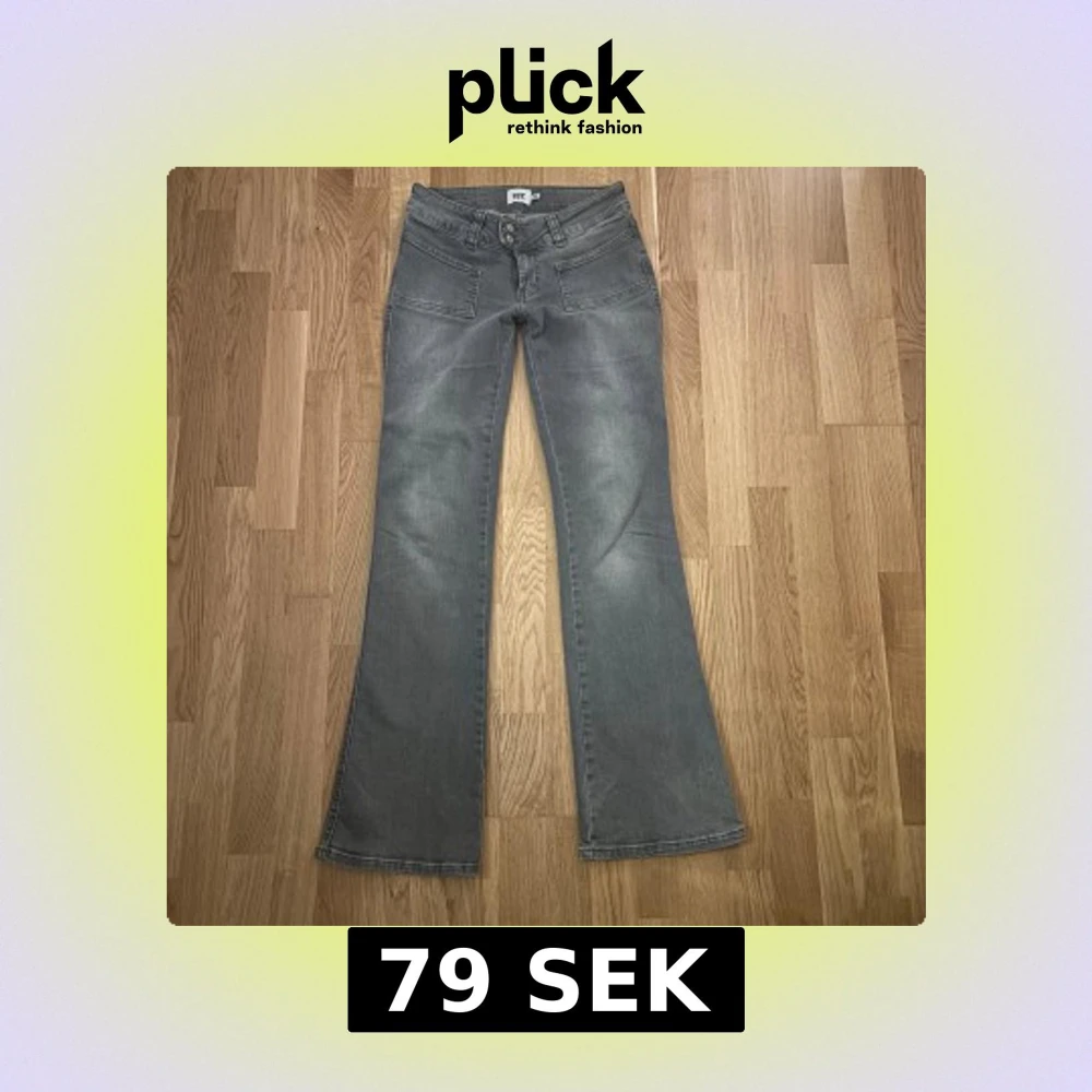 Grå jeans från 157, modell Paris Patch, i bootcut-stil med full längd. Byxorna har framfickor med patch-detalj och klassiska bakfickor. Snygg tvättad grå färg och tillverkade i bomullsmix för en skön känsla. Använda några få gånger, fint skick!