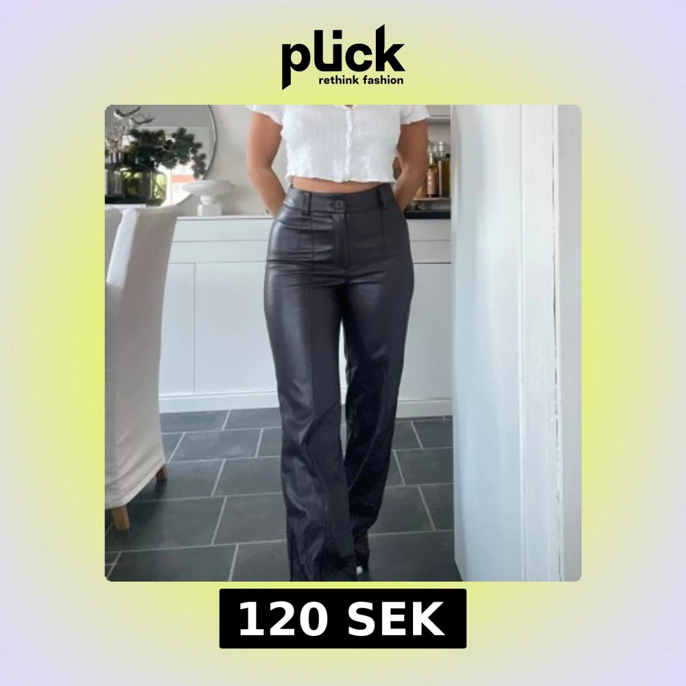 Mörklila skinnbyxor med hög midja och bootcut-stil samt pressveck . Midjemått 33,5. Innerben 79cm