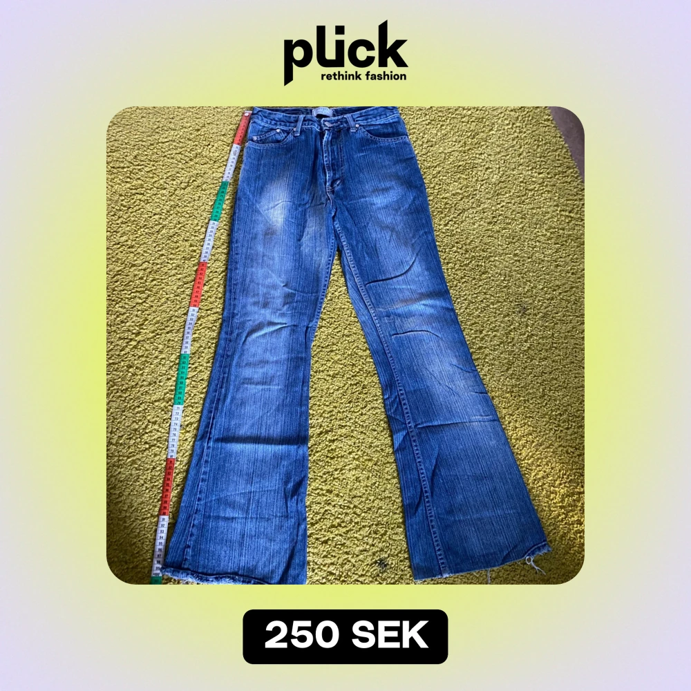 Gulliga byxor som e stora på mig så säljer, de är lite slitna vid ben öppningen, Mått: midja 35cm Ben öppning 25cm Upp till ner 101 cm