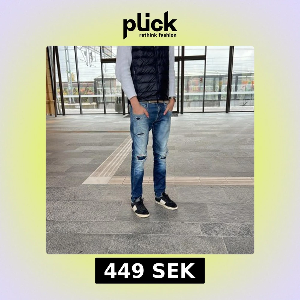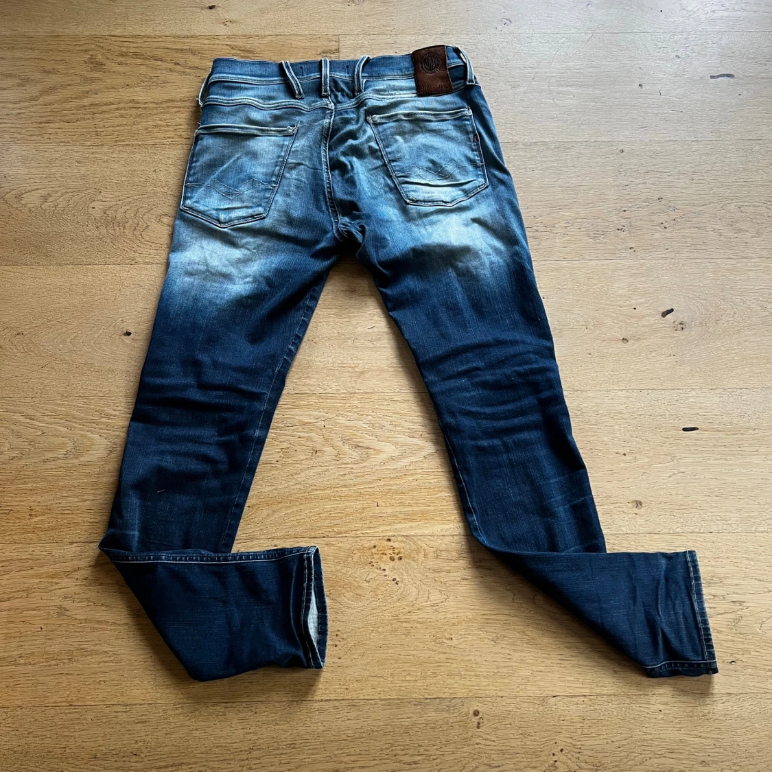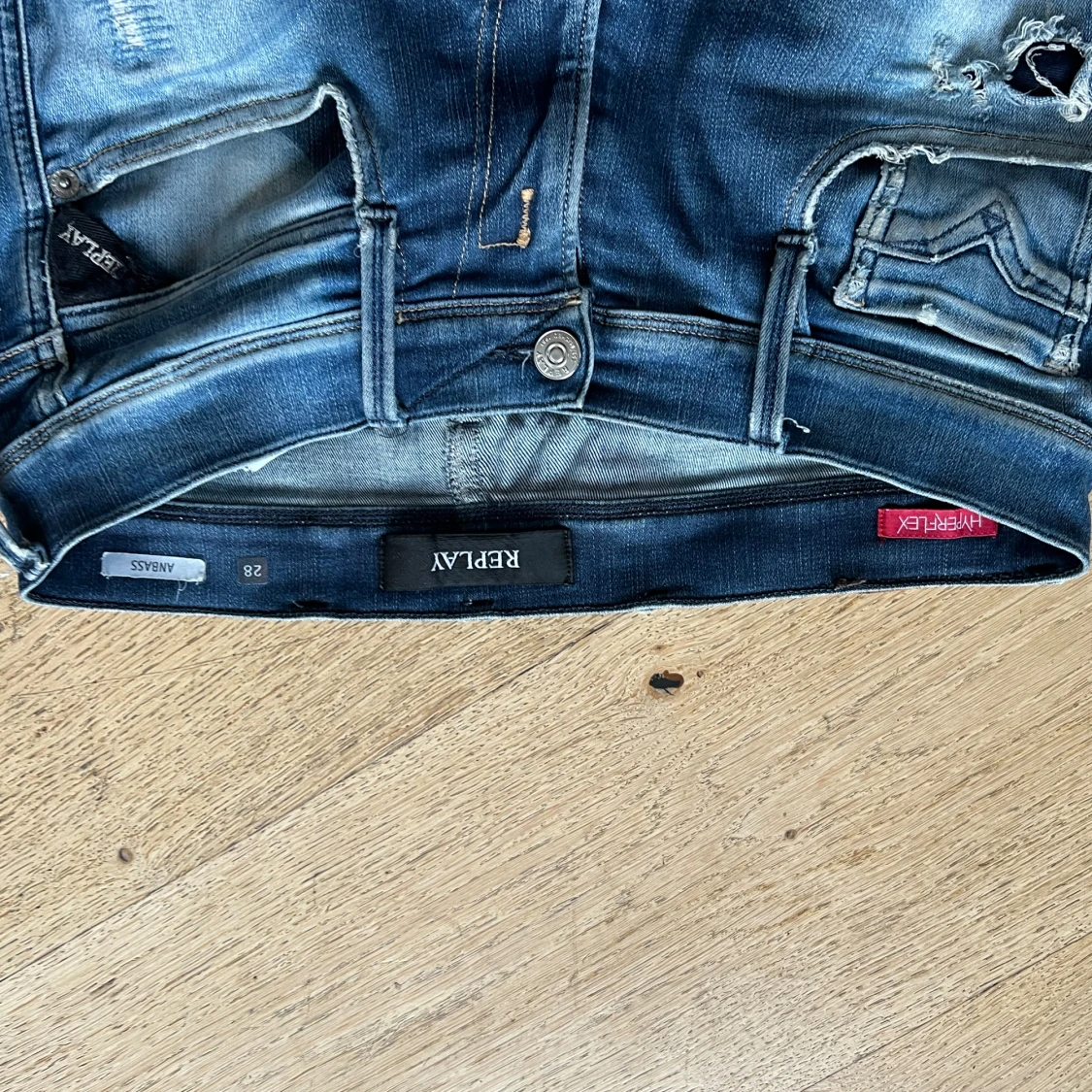 Säljer ett par Replay Anbass Hyperflex jeans i blå tvätt med slitningar och hål på knäna. Jeansen har slim/straight passform, klassisk femficksdesign och stretchigt material för extra komfort. Snyggt slitna detaljer och cool faded effekt. Jeansen är väldigt använda och det kan man se på slitningarna som har gått upp!