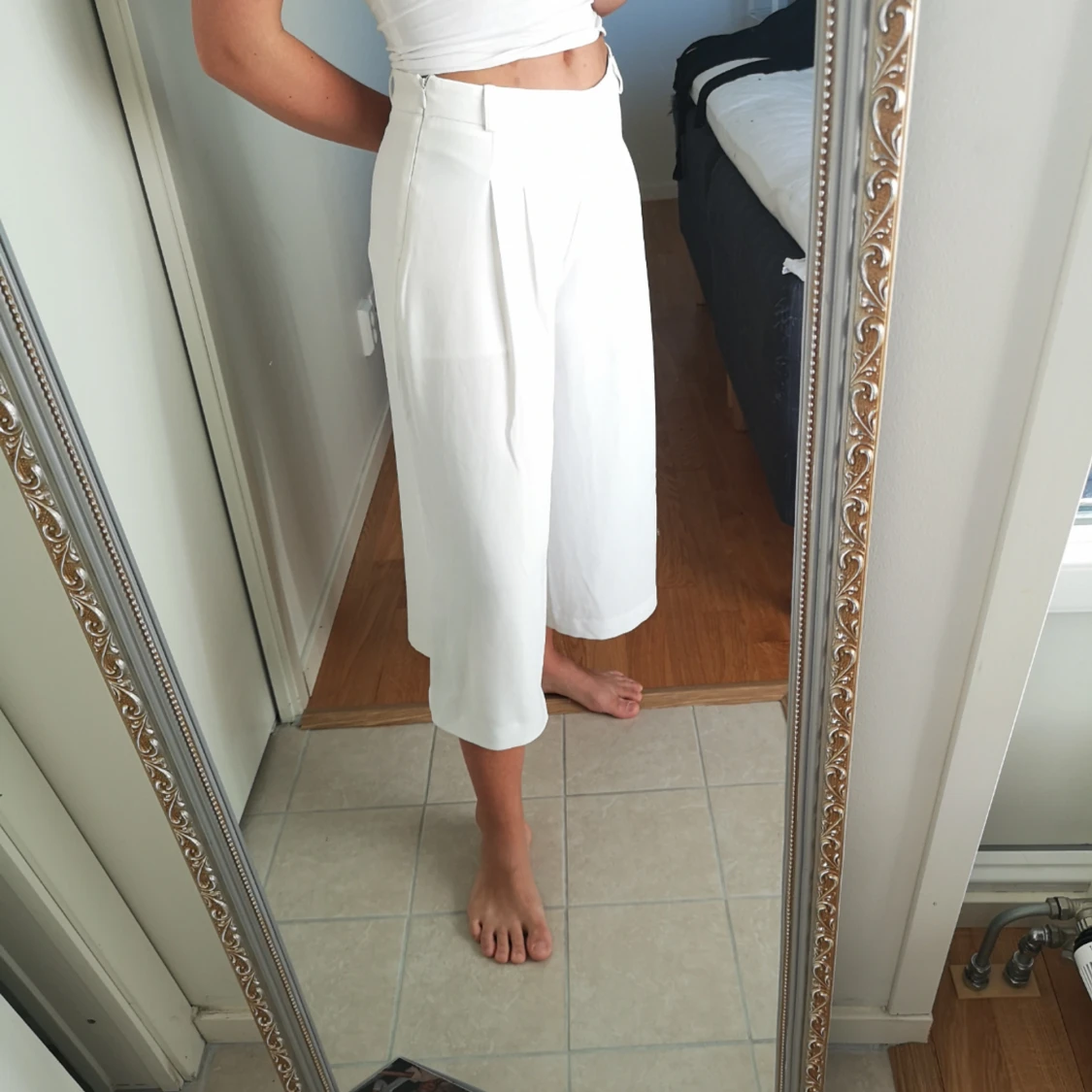 Croppade vita byxor, innebyxor högst upp så ej genomskinliga. Sömmen har släppt lite vid ena benet (därav priset), enkelt fixat med lite tråd och nål!