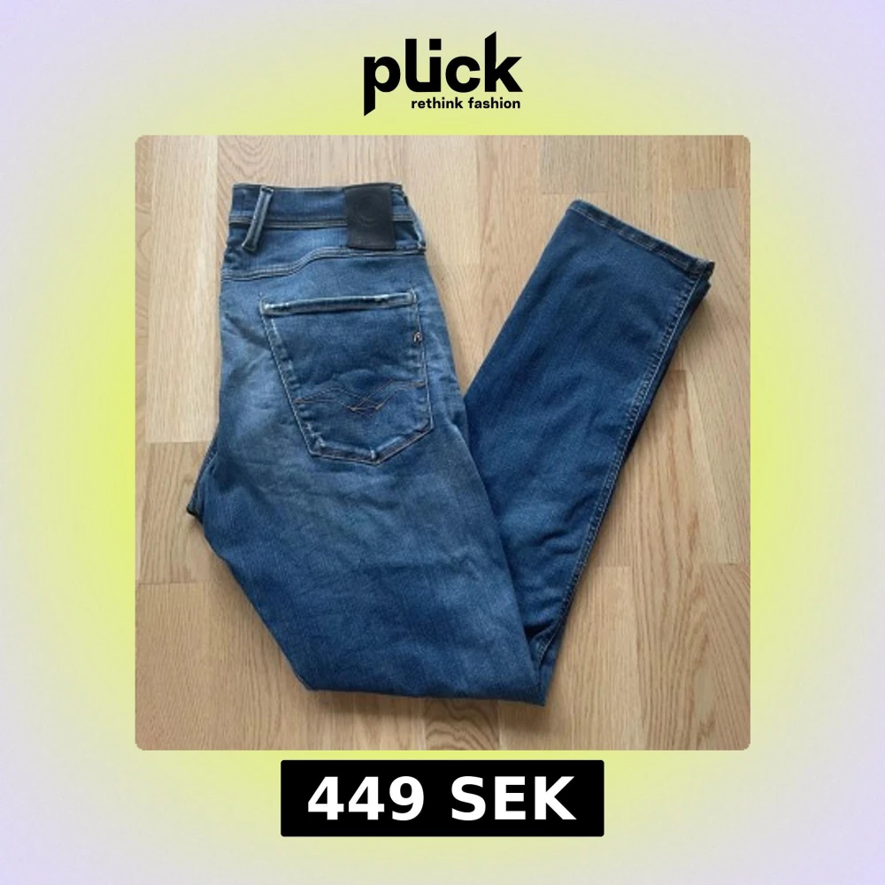 Jag säljer dom här riktigt snygga Replay Anbass jeansen som är i storlek W33 L32. De är i fint skick utan skador. Det finns snygga slitningar på fickorna. Tveka inte att höra av er! Mått: Längd=103cm. Midja=41cm