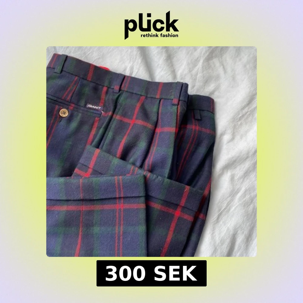 Kostymbyxor från Gant i klassiskt rutigt mönster med blå, röda och gröna toner. Byxorna har rak passform, bälteshällor och knäppning med knapp. Materialet är en mix av ull och polyester. Mellanhög midja. Mått- midja: 76cm, innerben: 80cm. Byxöppning: 23cm. Kan användas bland annat i ”creative black tie”!