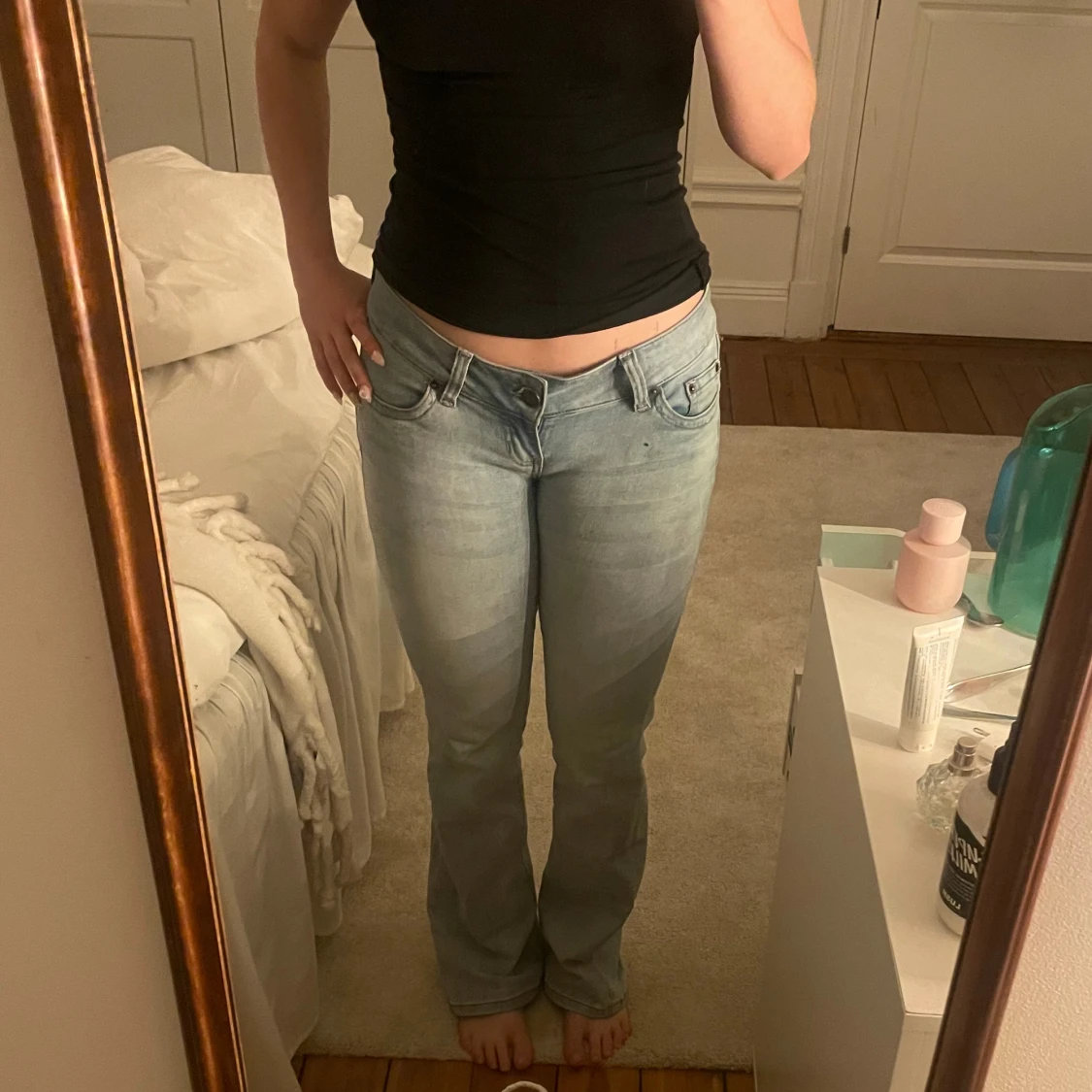 G rise jeans i färgen Ice. Nypris :1299kr. Storleken i midjan är M, passar mig som brukar ha S i underdelar. Längden är i regular vilket är långt på mig som är 166 cm. Mina är slitna längst ner på jeansen (sista bilden) vilket inte syns när de är på 🩷