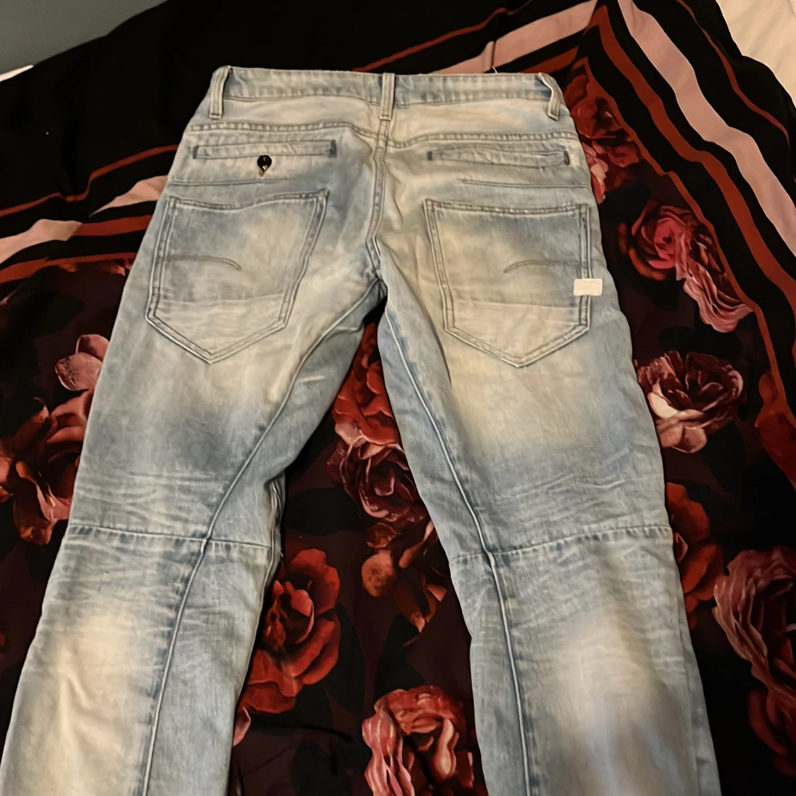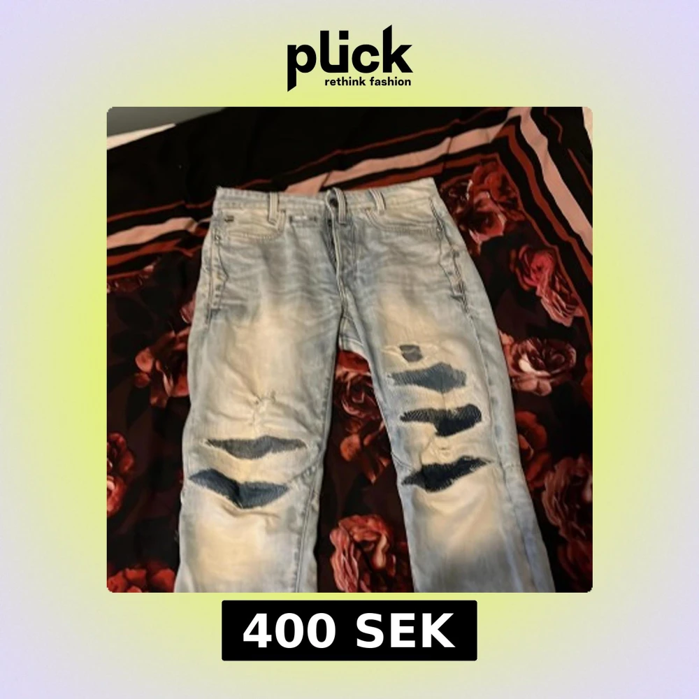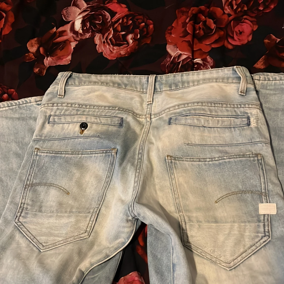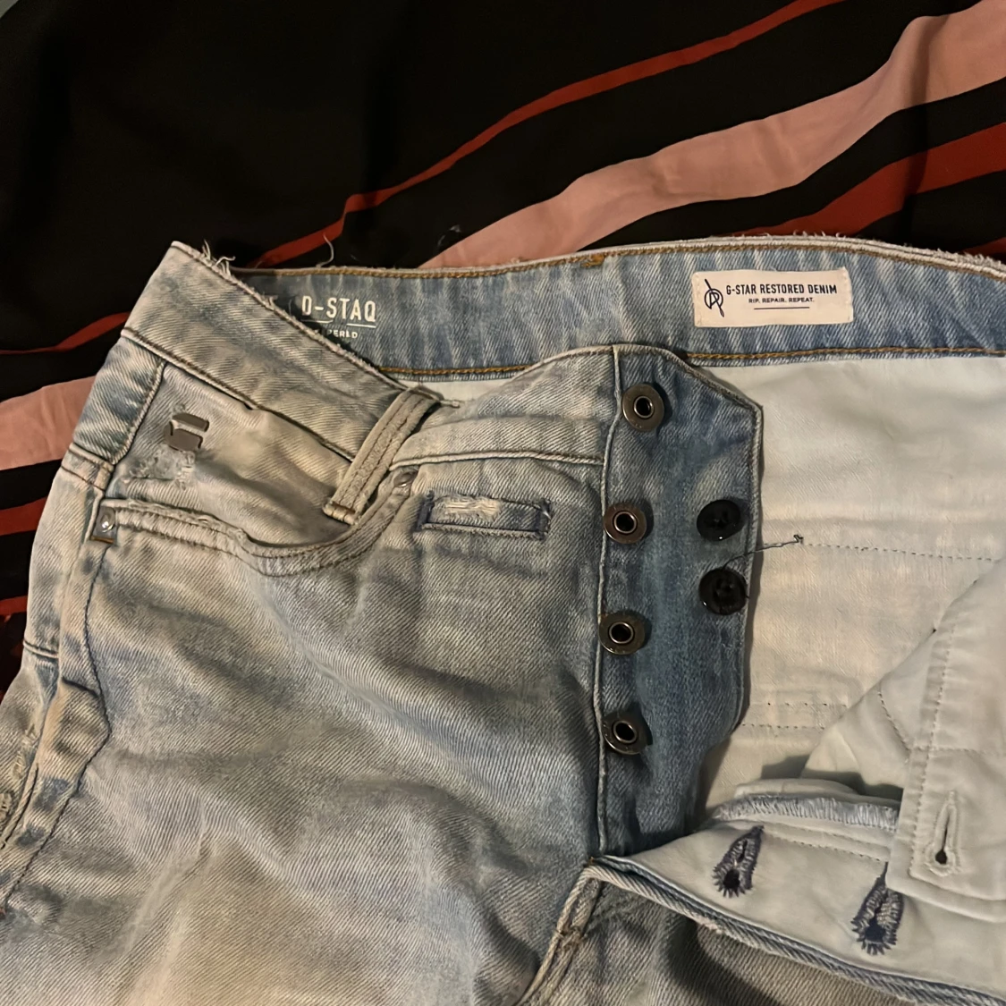 Ljusblå jeans från G-Star RAW, modell D-Staq, med snygga slitningar och hål på benen för en trendig look. Jeansen har knäppning med knappar, fem fickor och är tillverkade i klassisk denim.