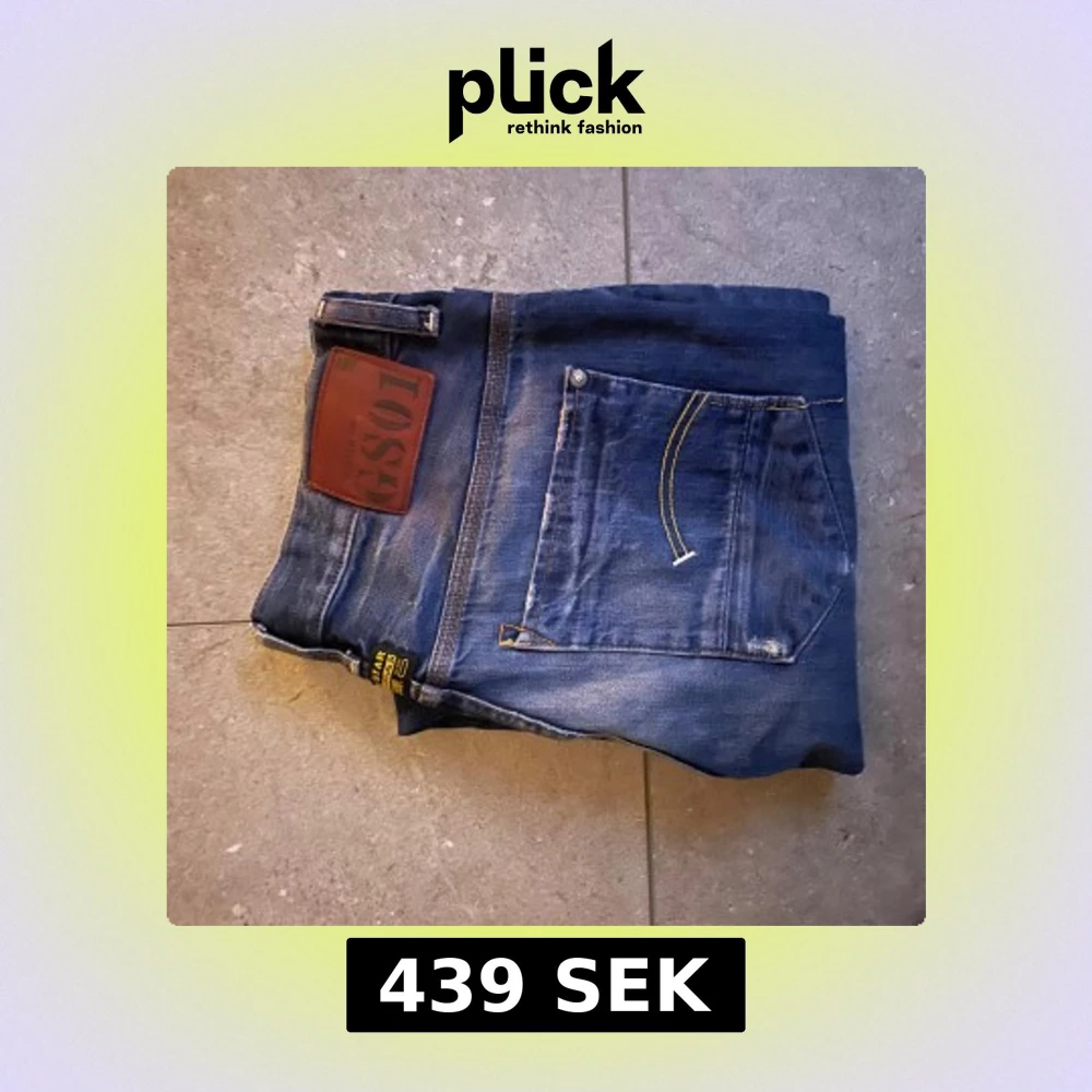 Säljer ett par klassiska blå jeans från G-Star RAW med snygga slitningar och raka ben. Jeansen har fem fickor, tydliga kontrastsömmar och en stor brun logopatch bak. Perfekta för dig som gillar en tidlös och avslappnad stil.