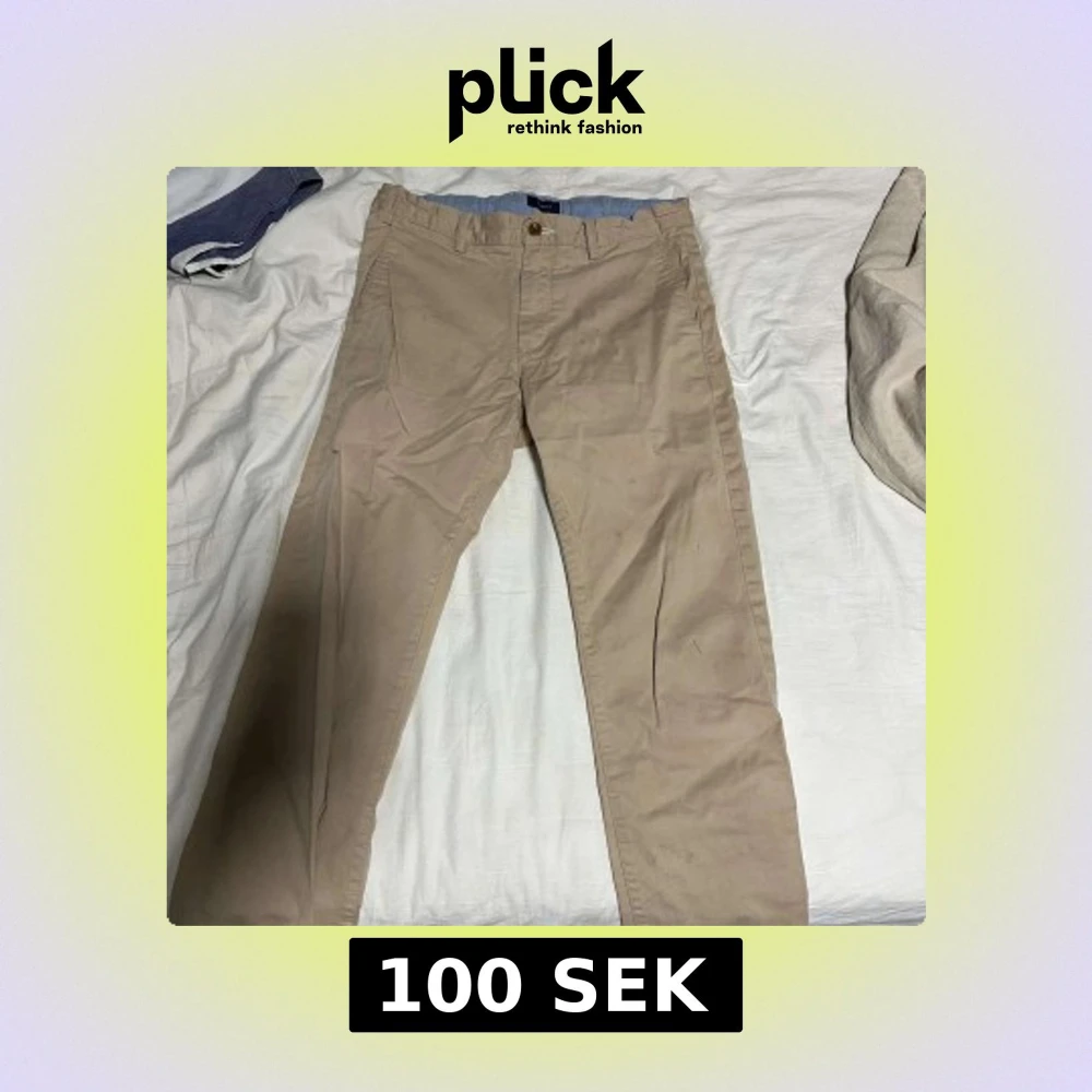 Säljer ett par stilrena beige chinos från GANT. Byxorna har en klassisk design med knappar och fickor både fram och bak. Perfekta för en avslappnad men ändå uppklädd look. Finns få fläckar