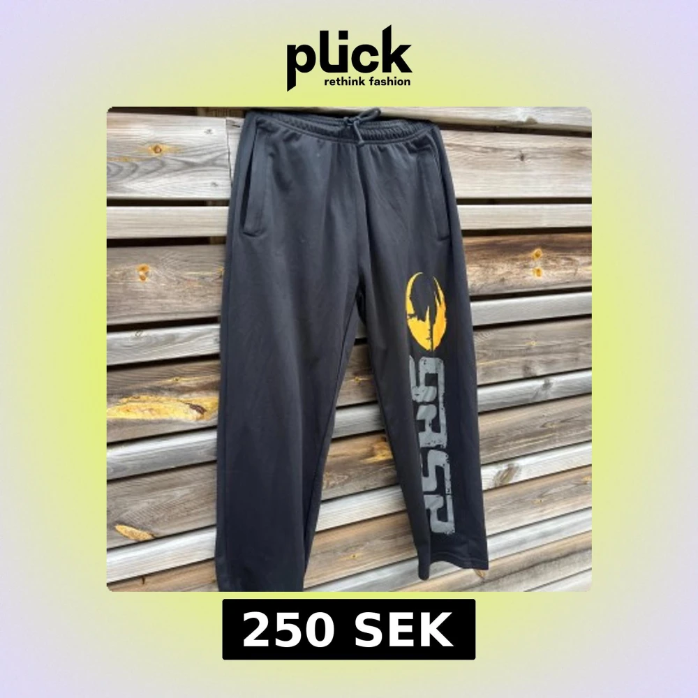 Svarta mjukisbyxor från Gasp i storlek S med elastisk midja och snörning. Byxorna har två sidofickor och en stor gul och grå logga längs ena benet. Tillverkade i mjukt syntetmaterial, perfekta för chill eller träning.