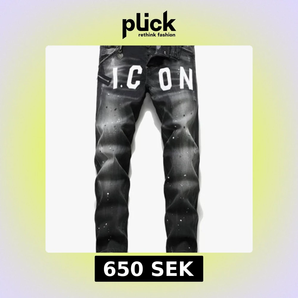 Svarta jeans med coolt vitt ICON-tryck över framsidan och stänkdetaljer för en edgy look. Byxorna har normal passform och klassisk femficksdesign. Perfekt för dig som vill sticka ut med din stil. helt nya med allt. fraktar inom 24 timmar