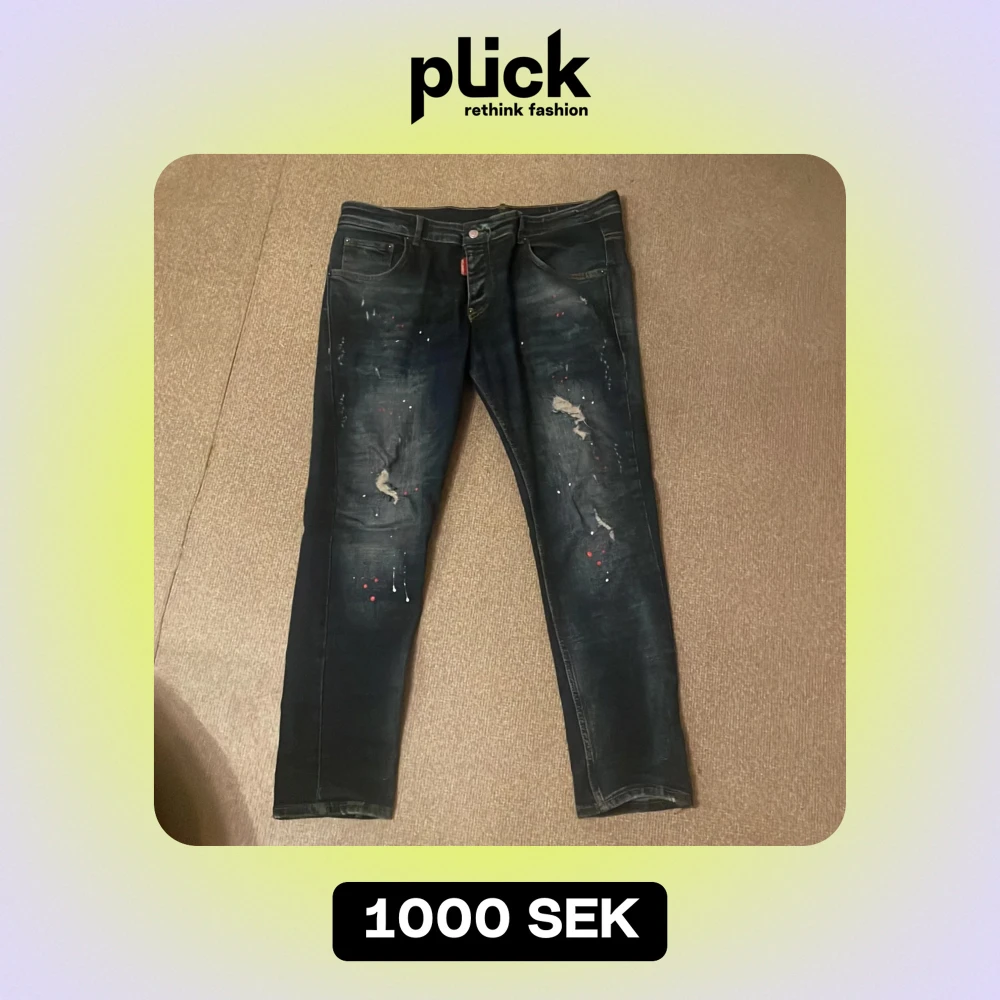 Säljer ett par blåa jeans från Dsquared2 i storlek 52. De har en cool, sliten look med färgstänk och slitningar. Perfekta för en avslappnad och trendig stil. Passar bra till både vardag och fest! Inga skador. Priset kan snackas