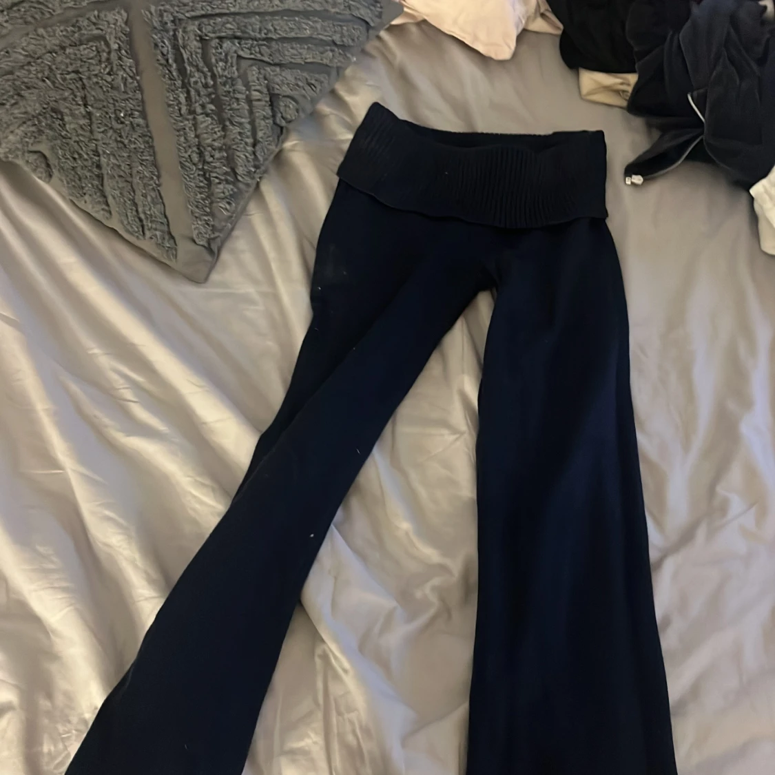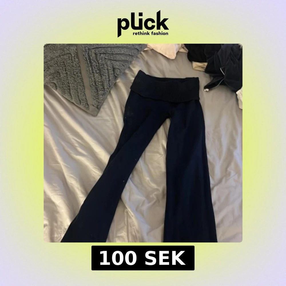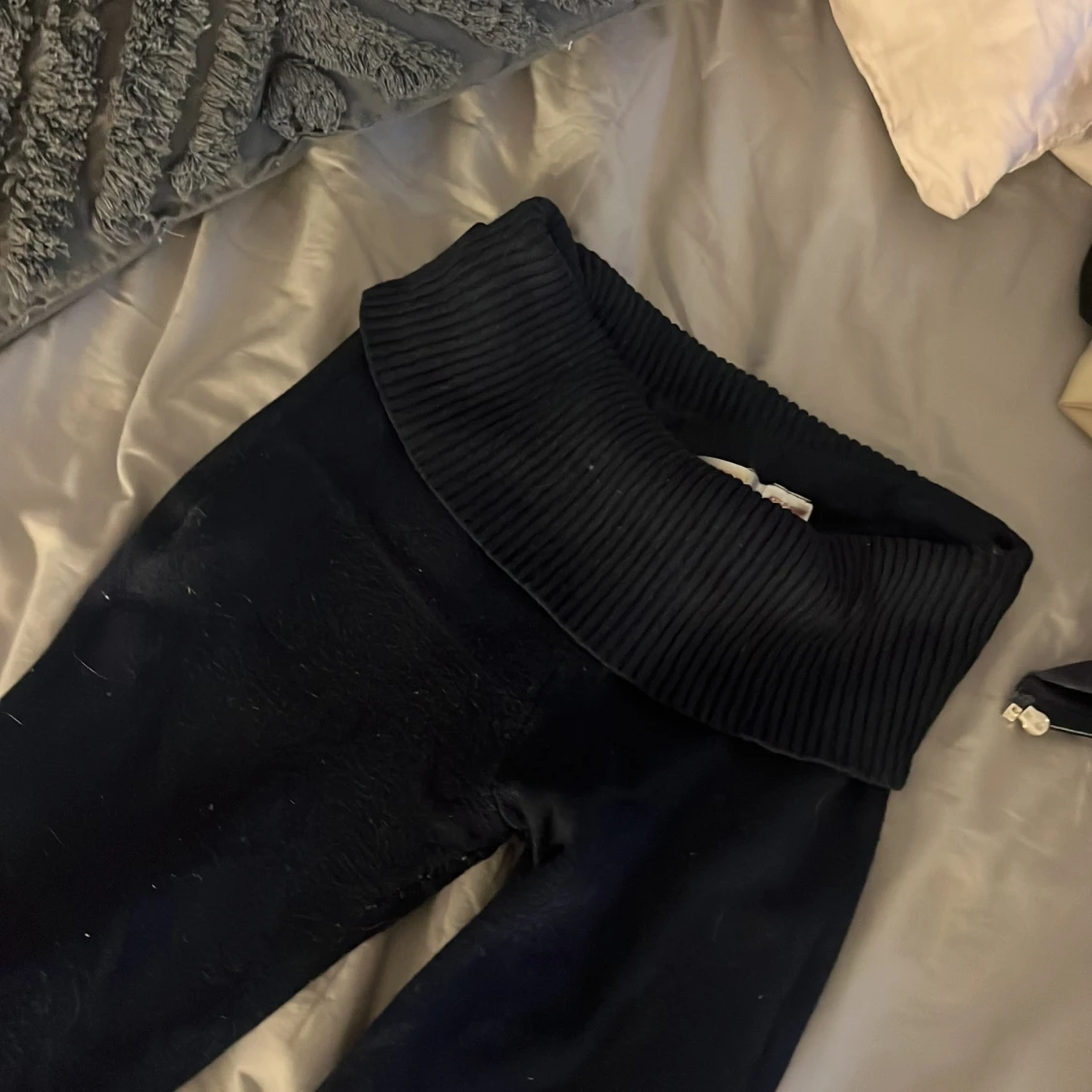 Säljer ett par mörkblå stickade byxor med bred ribbad midja. Byxorna har en rak och något utsvängd passform, perfekta för en chill och avslappnad stil. Materialet är mjukt och stretchigt, vilket gör dem riktigt bekväma att ha på sig.