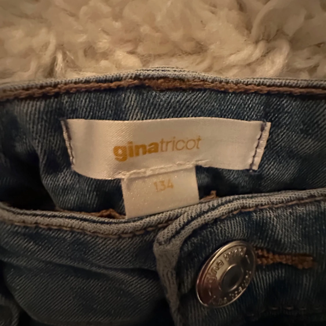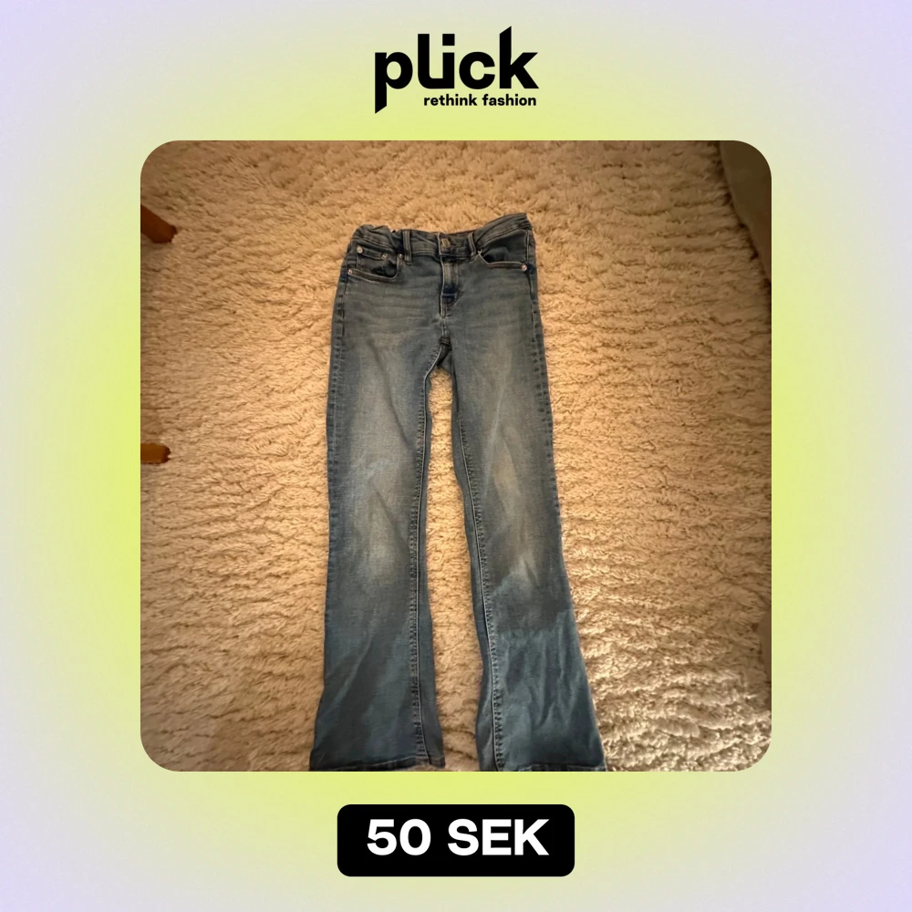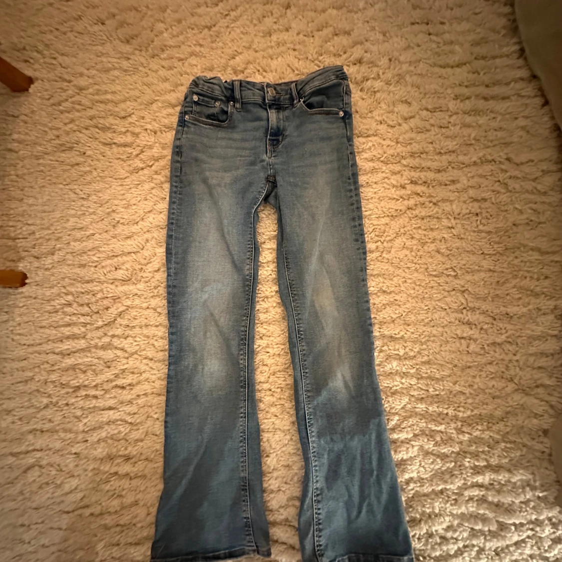 Säljer ett par snygga blå jeans från Gina Tricot i storlek 134.De är bootcut och lowaist. Jeansen är i bra skick och har en bekväm passform. Perfekta för skolan!
