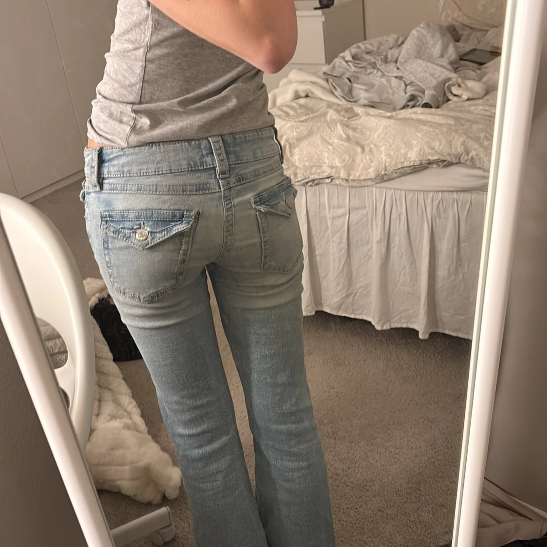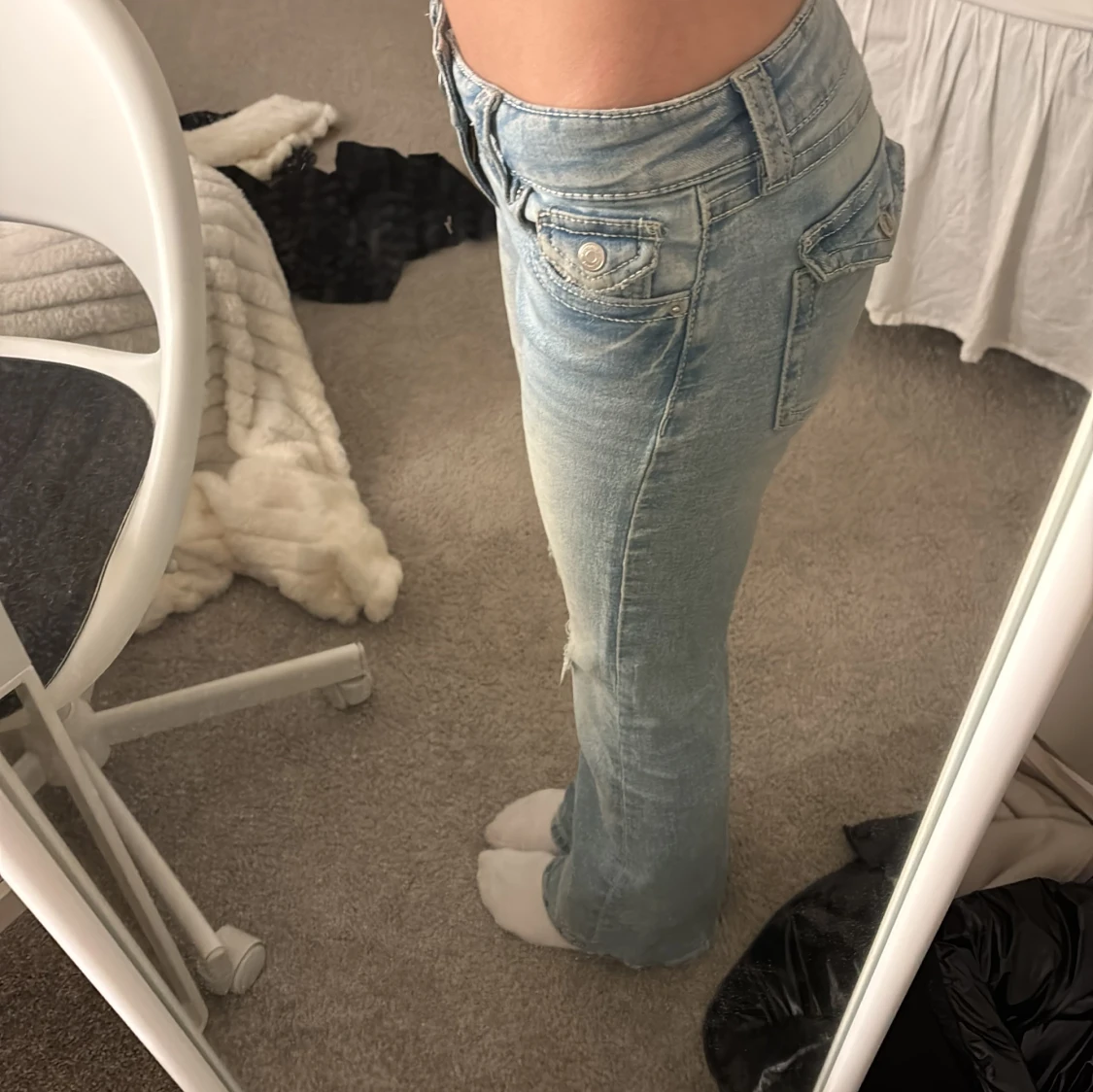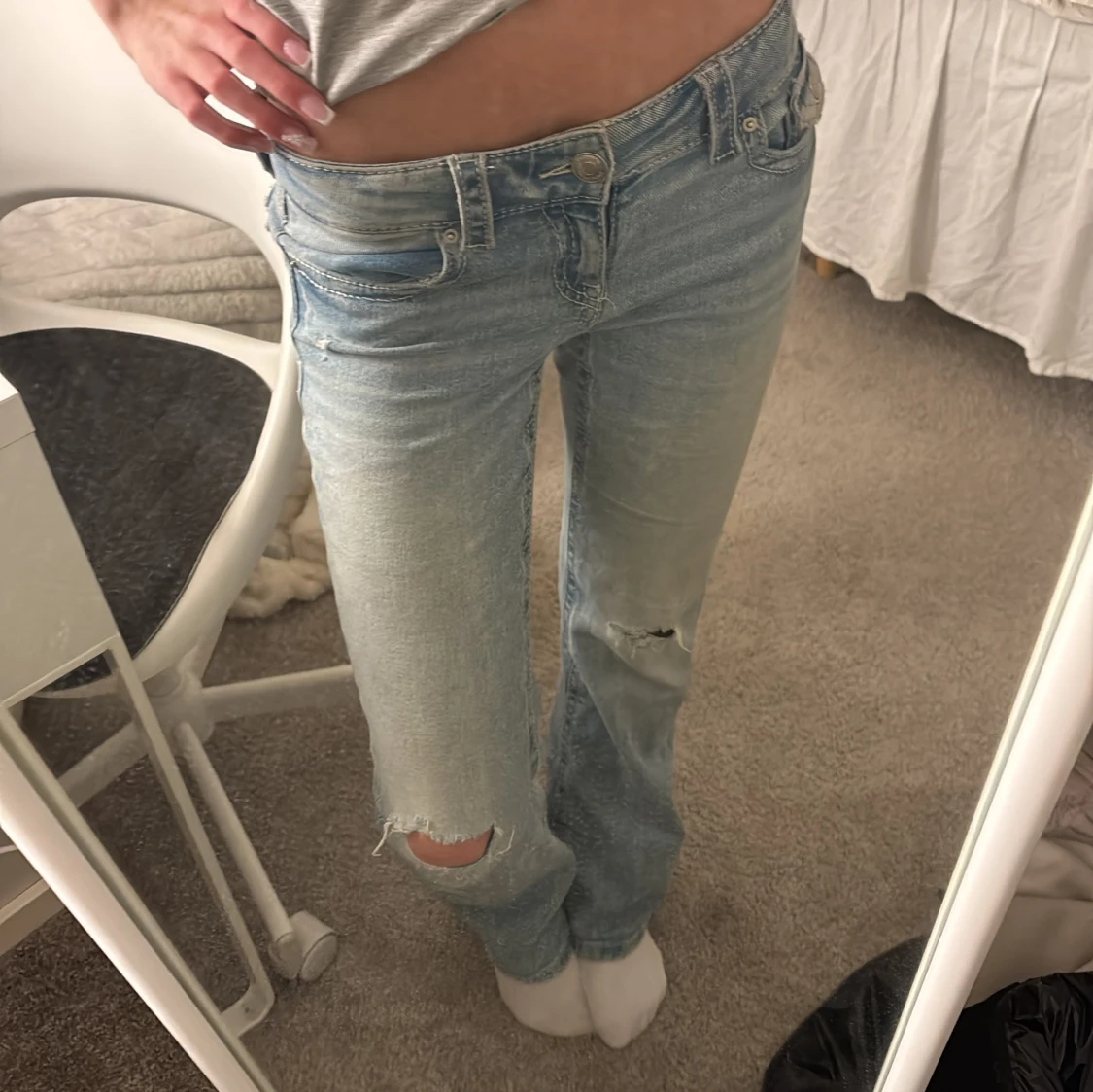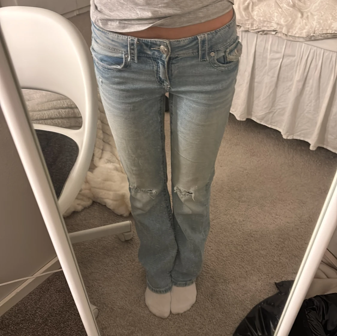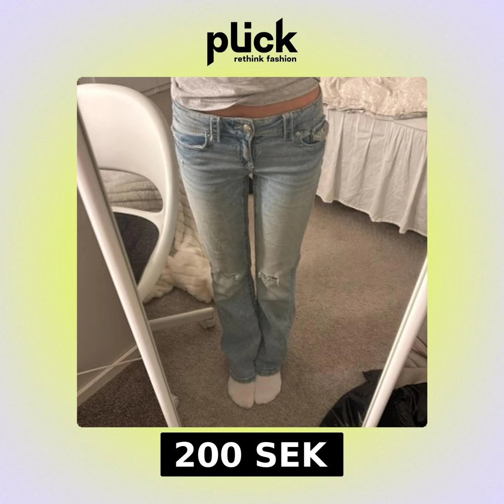 Säljer ett par ljusblå jeans med slitningar på knäna. De har en klassisk femficksdesign och knappgylf. Perfekta för en avslappnad stil. Ett litet hål där vid bakfickan men inget som syns för mycket!