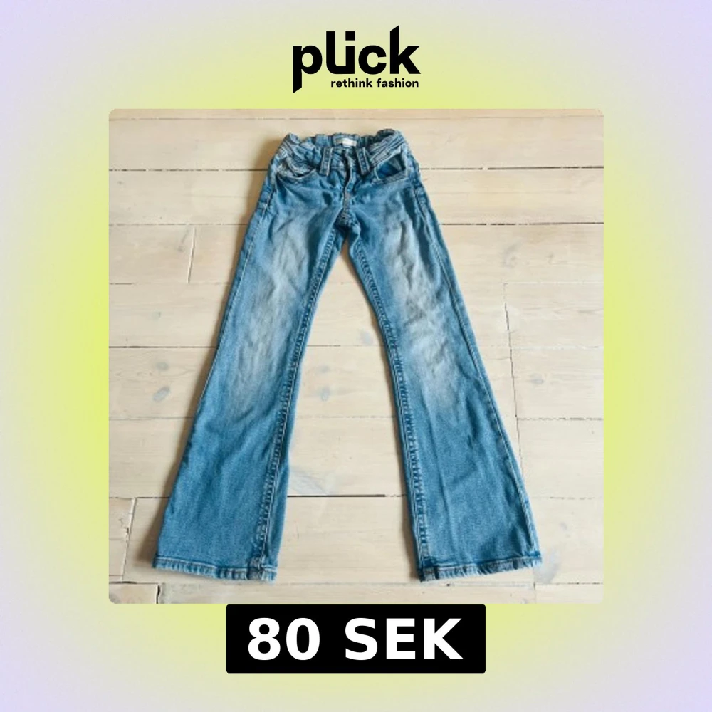 Snygga ljusblå jeans från Gina Tricot i klassisk bootcut-modell. Jeansen har fem fickor, hällor för bälte och dragkedja med knapp. Tillverkade i mjuk bomullsdenim med lätt tvättad look och kontrastsömmar.
