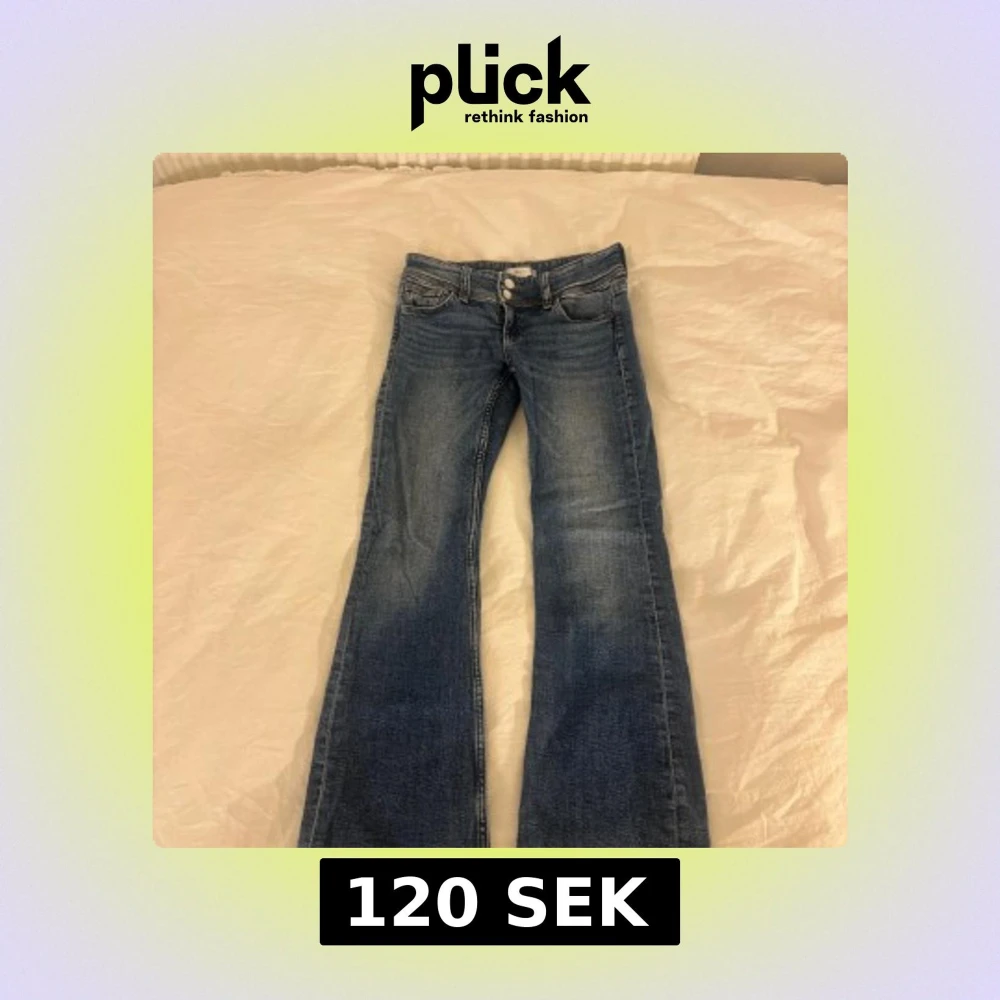 Snygga blå jeans från Gina Tricot i storlek 146 med klassisk bootcut passform. Jeansen har två framfickor, dubbla knappar i midjan och bakfickor med knappdetalj. Materialet är jeans med lätt tvättad look och kontrastsömmar.