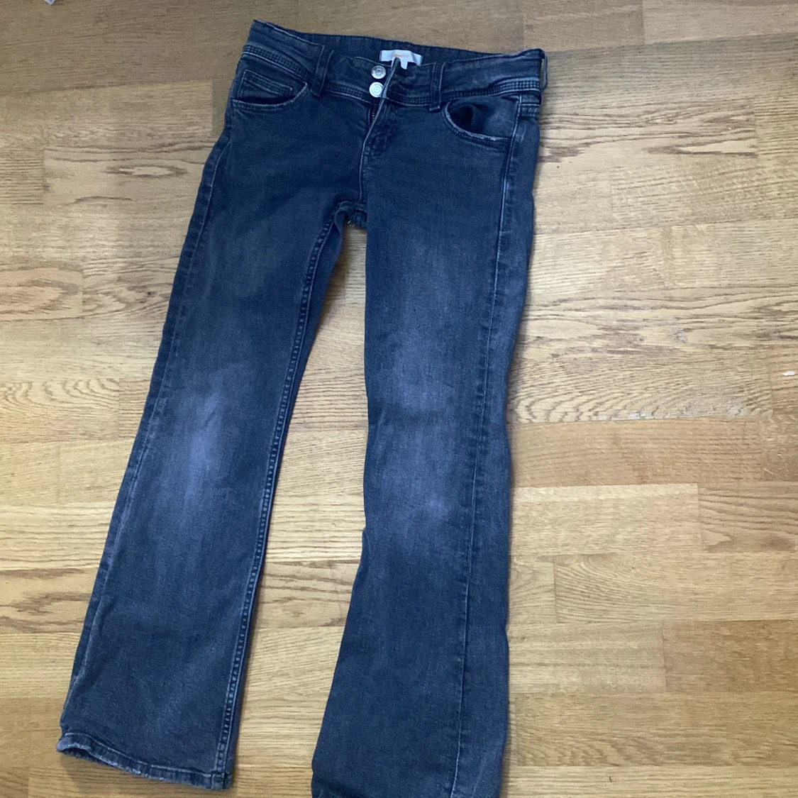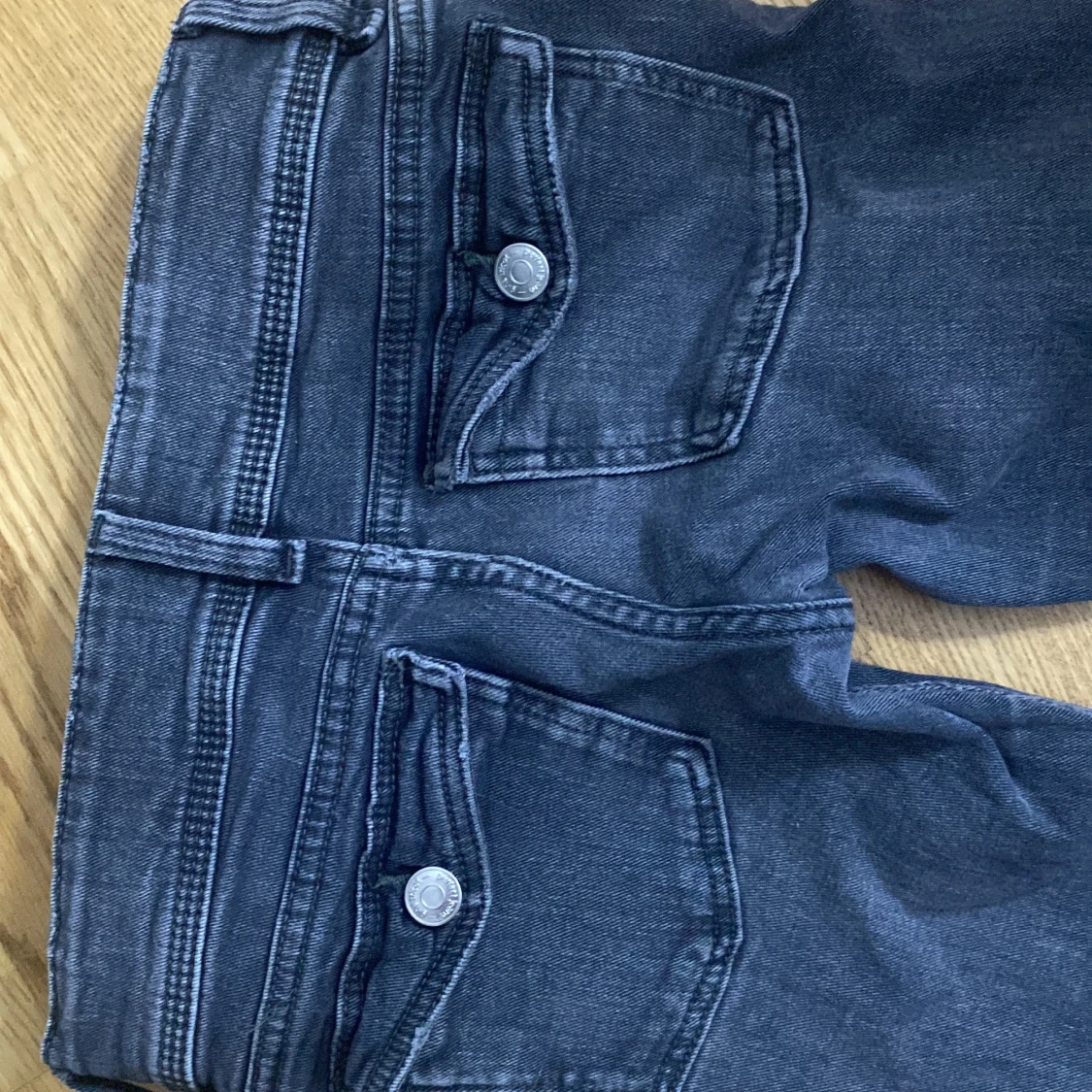Snygga mörkblå jeans med bootcut och dubbla knappar fram. De har klassiska femficksdetaljer och en dragkedja. Perfekta för en avslappnad stil. Bra skick 100kr och orginala priset ligger på 349kr