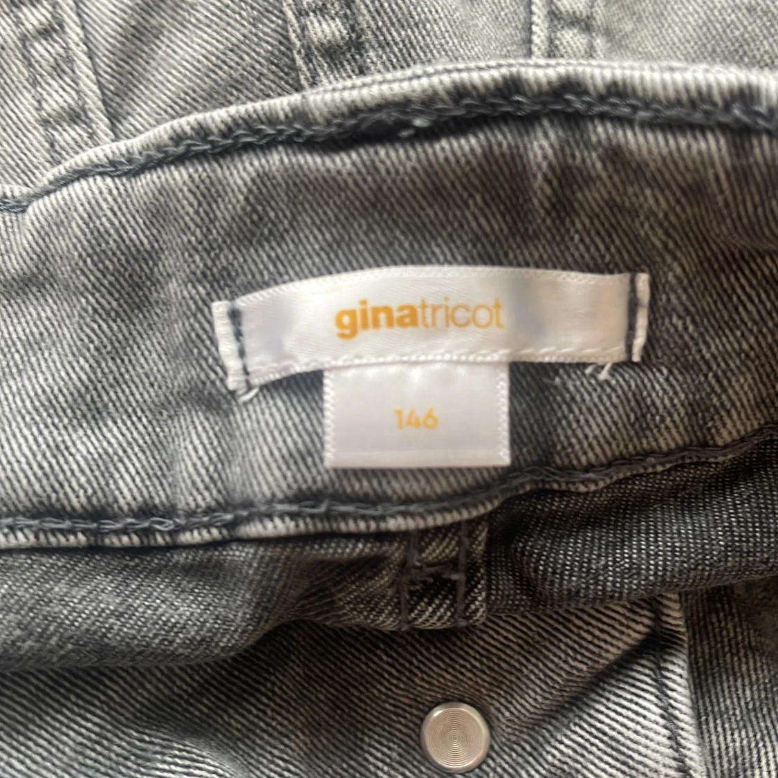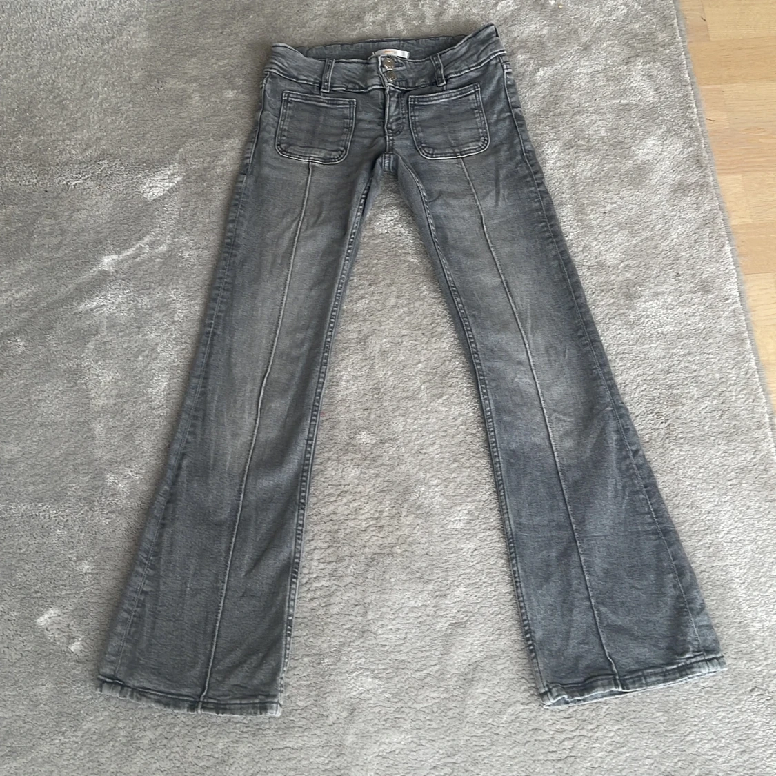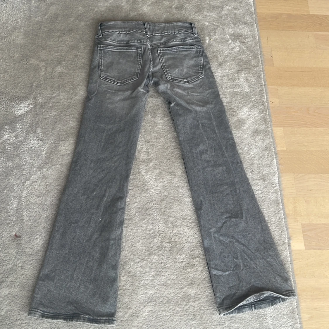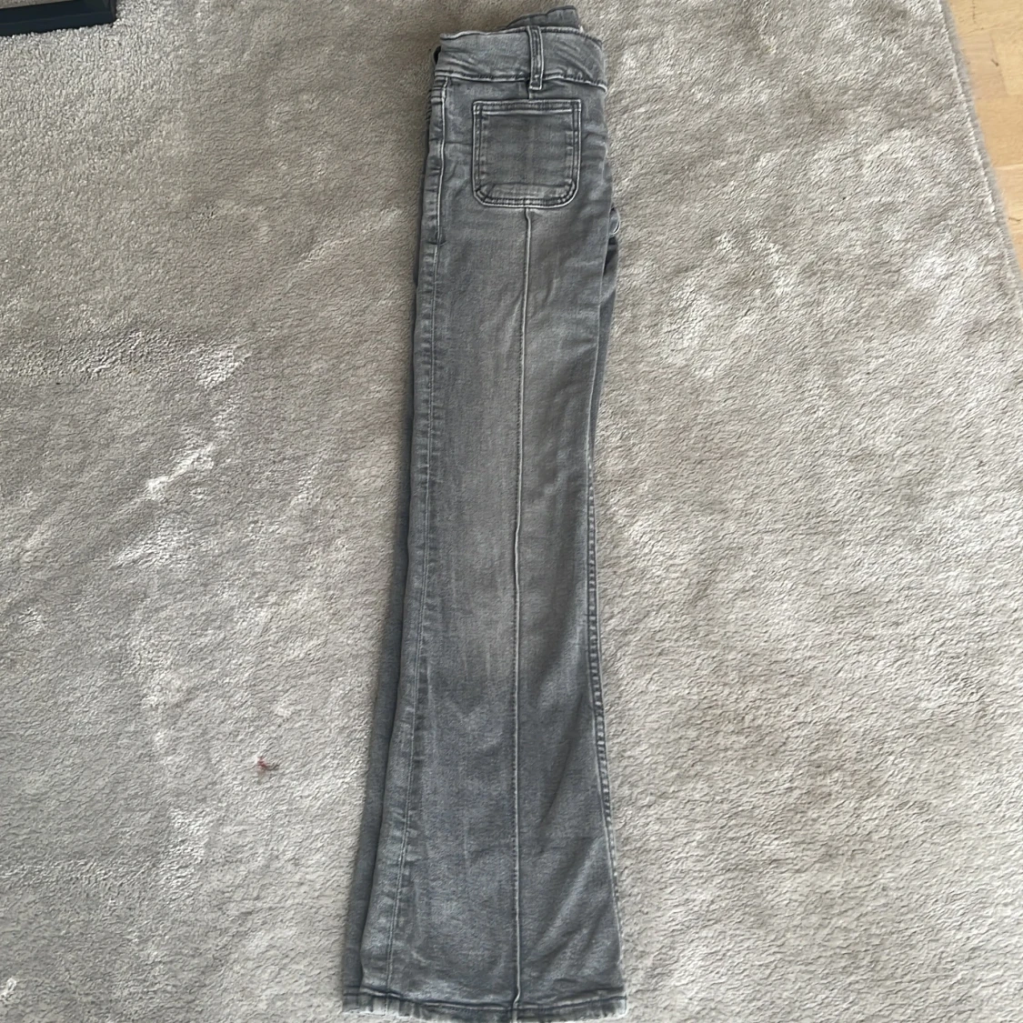 Snygga grå bootcut jeans från Gina Tricot. De har en klassisk femficksdesign och en bekväm passform. Perfekta för en avslappnad stil med en touch av retro. Säljer de för att de är försmå.