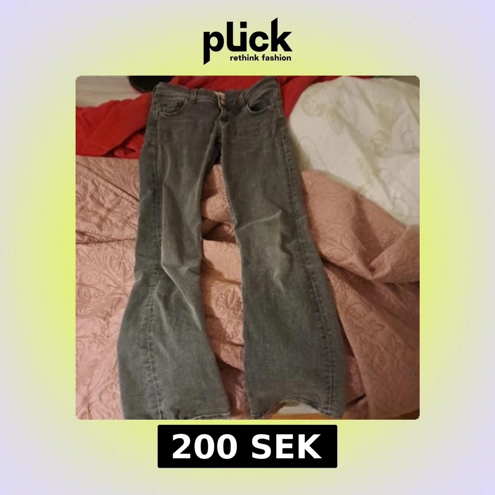 Snygga grå jeans från Gina Tricot i storlek 146. De har en klassisk femficksdesign med knappar framtill och bakfickor med lock. Perfekta för en avslappnad stil.