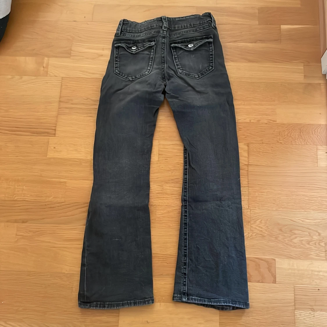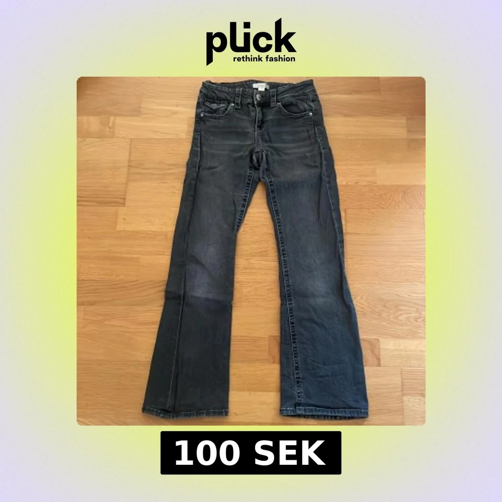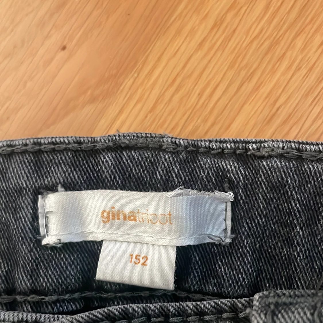 Svarta jeans från Gina Tricot i storlek 152. Modellen har bootcut-ben och klassisk femficksdesign med snygga detaljer på bakfickorna. Jeansen har en mörk tvätt och är tillverkade i ett mjukt denimtyg.