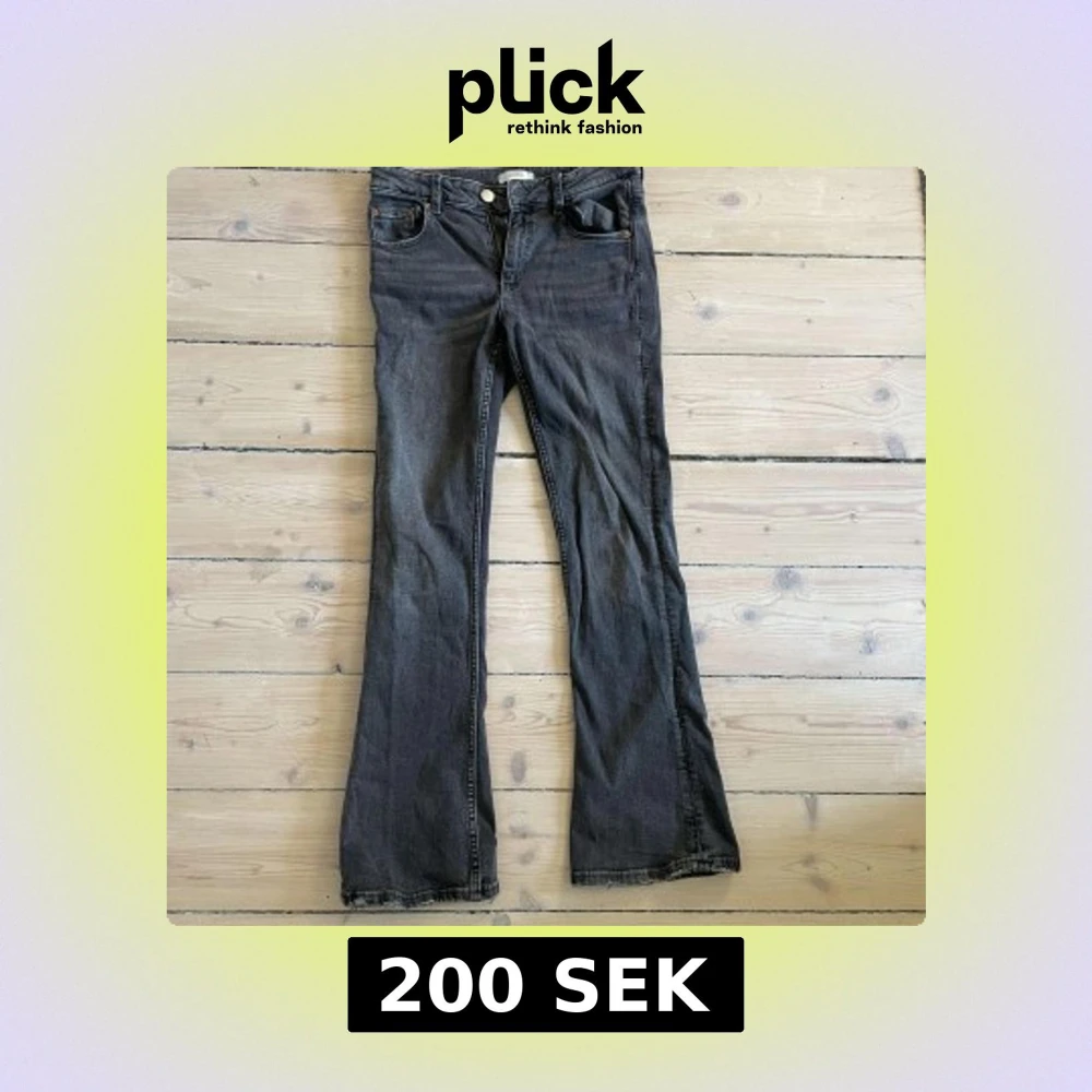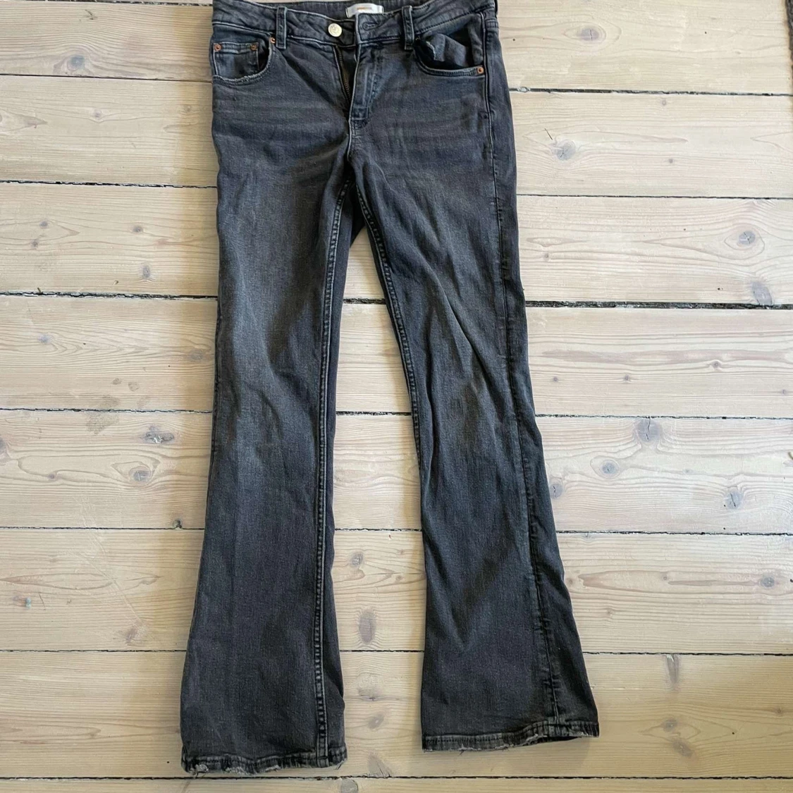 Säljer ett par svarta bootcut jeans från Gina Tricot. Jeansen har klassisk femficksdesign, knapp och dragkedja framtill samt utsvängda ben. Lappen är bortklippt men dom är strl 152💗 använd inte köp nu, kontakta mig innan 💗