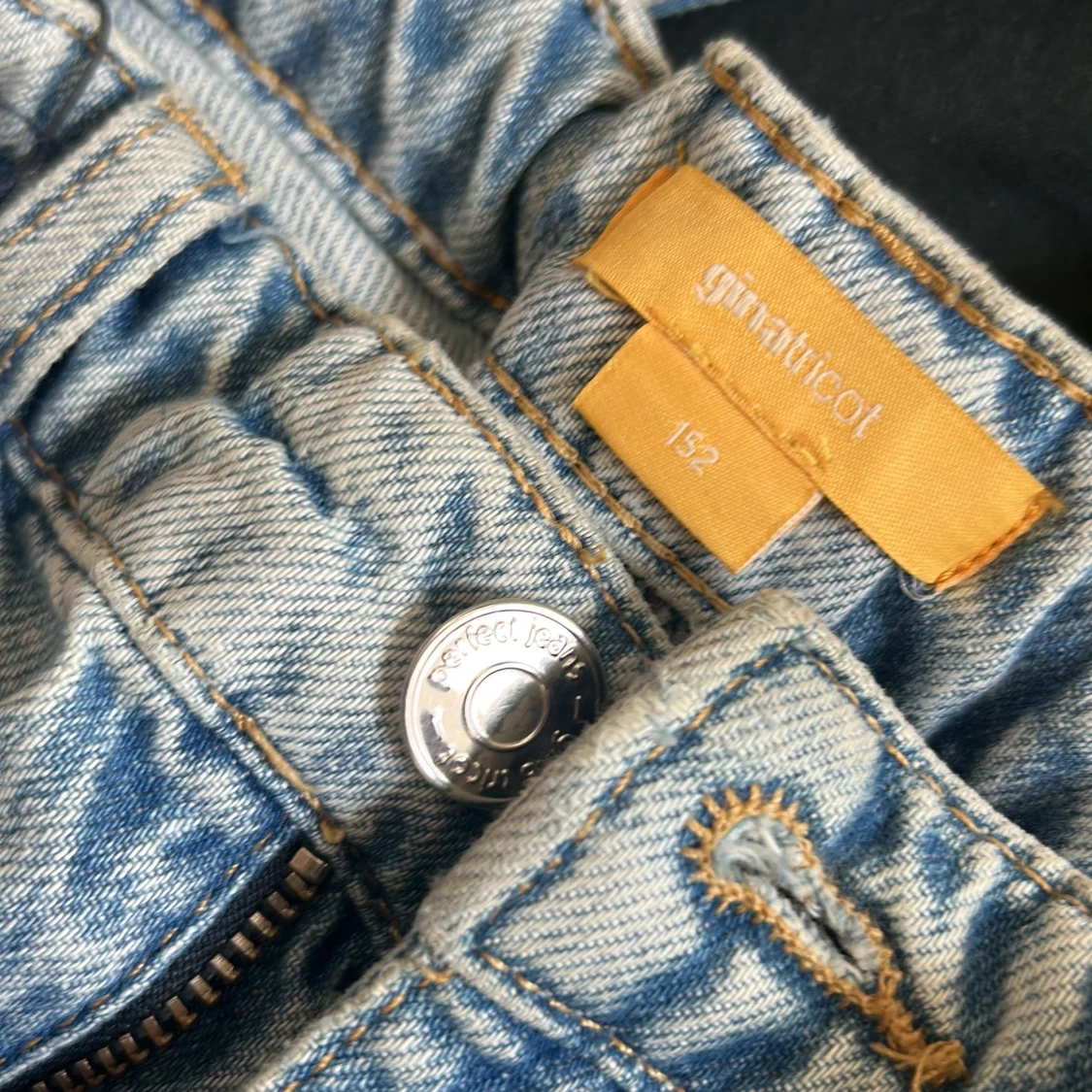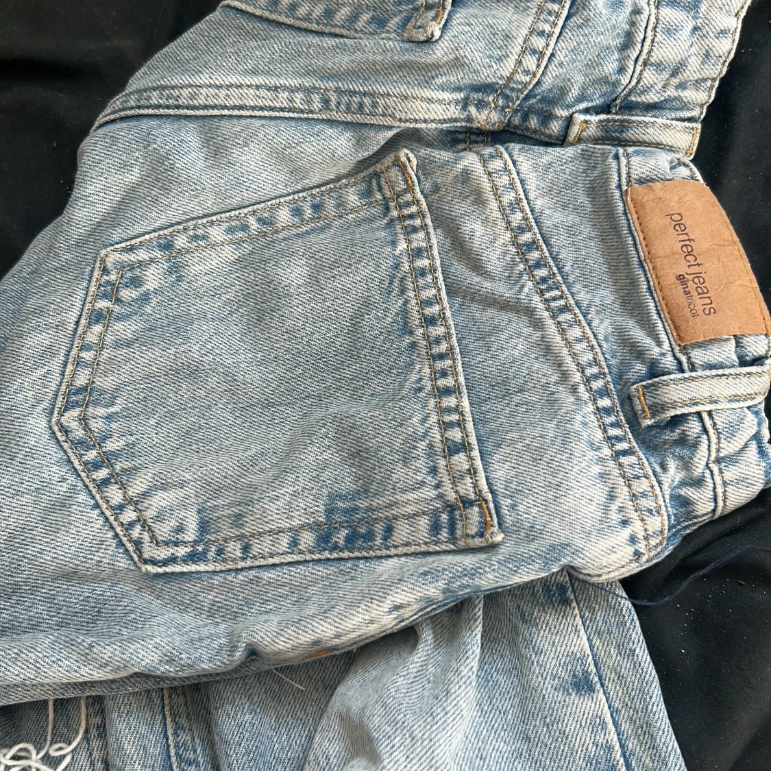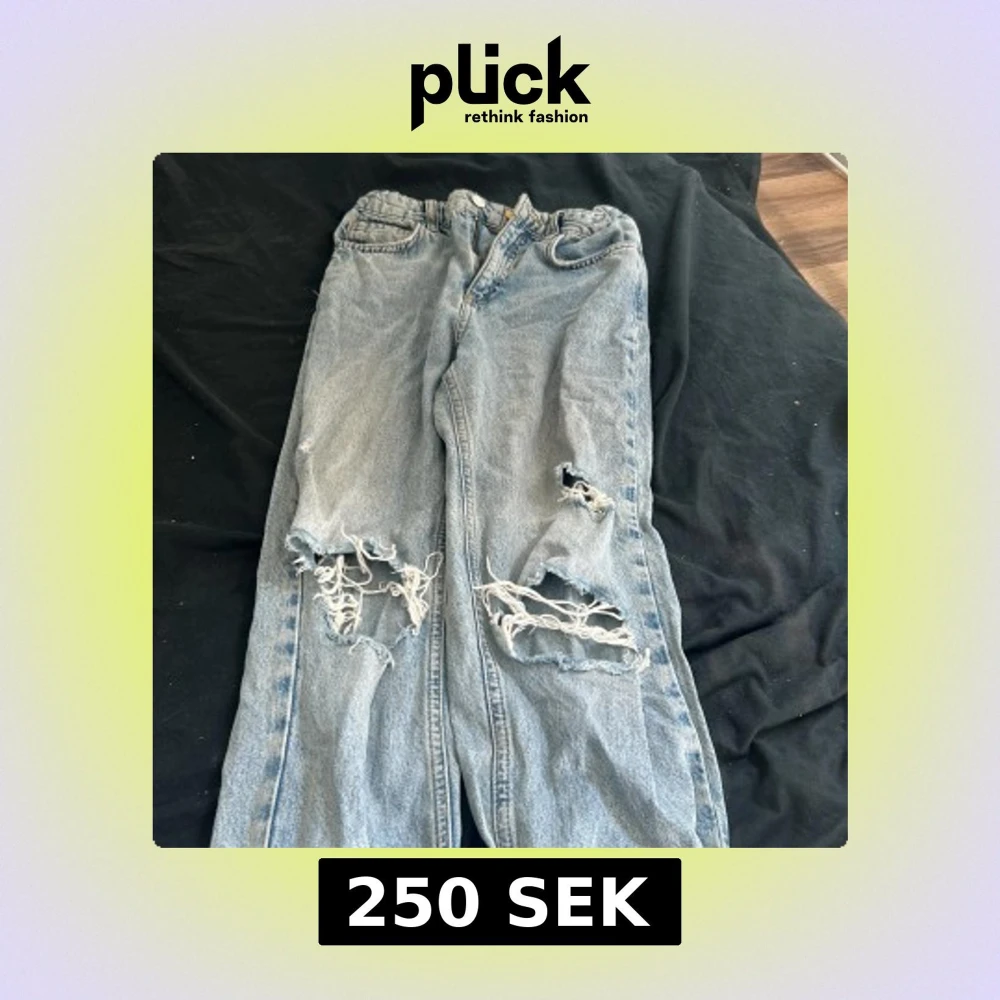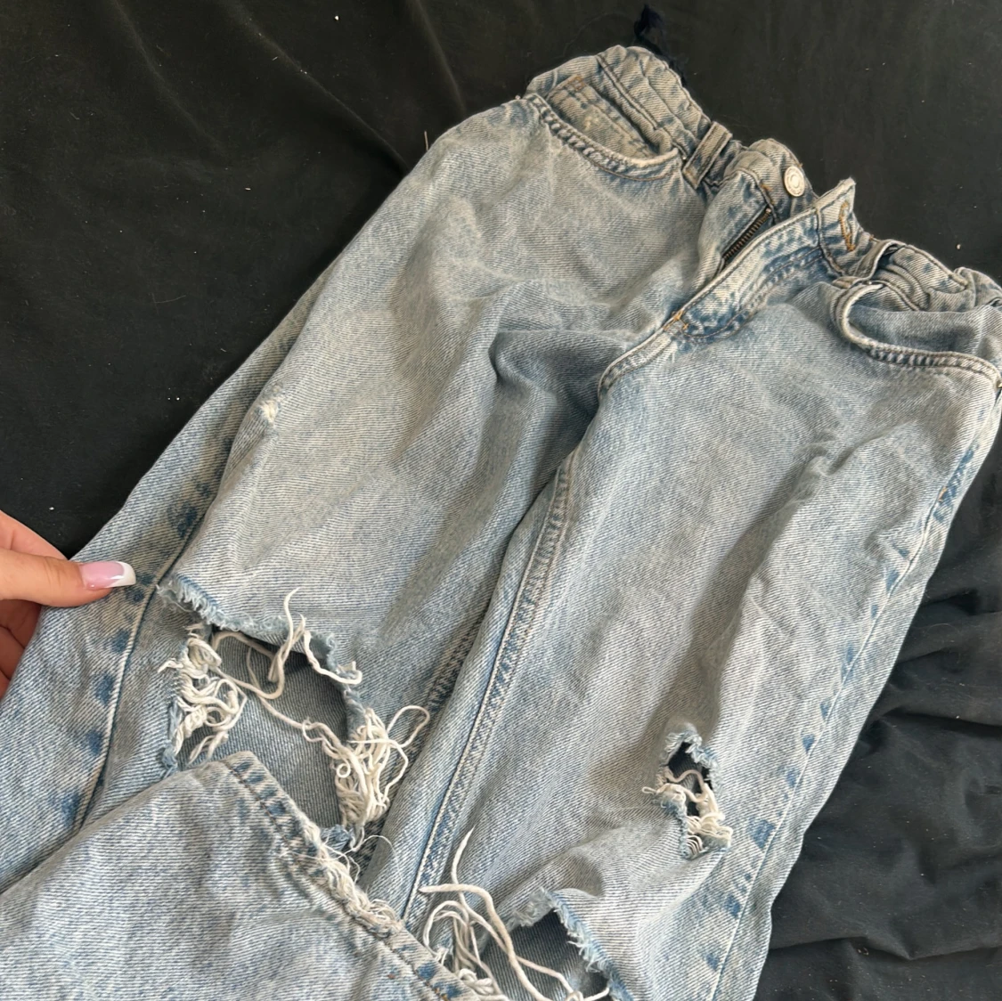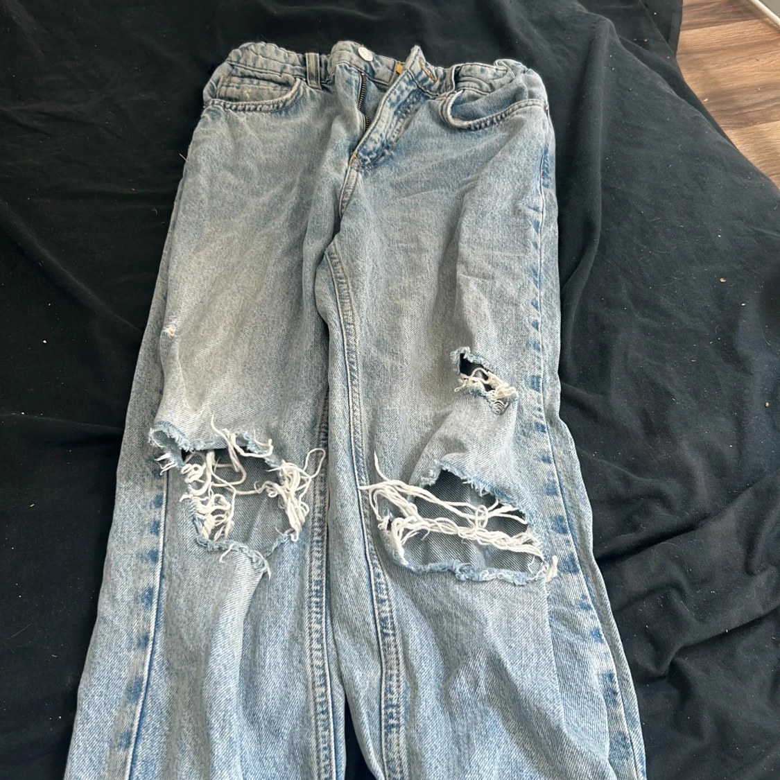 Säljer ett par ljusblå jeans från Gina Tricot med snygga slitningar och stora hål på båda benen. Klassisk femficksmodell med knapp och dragkedja. Perfekt för dig som gillar en avslappnad och trendig look.