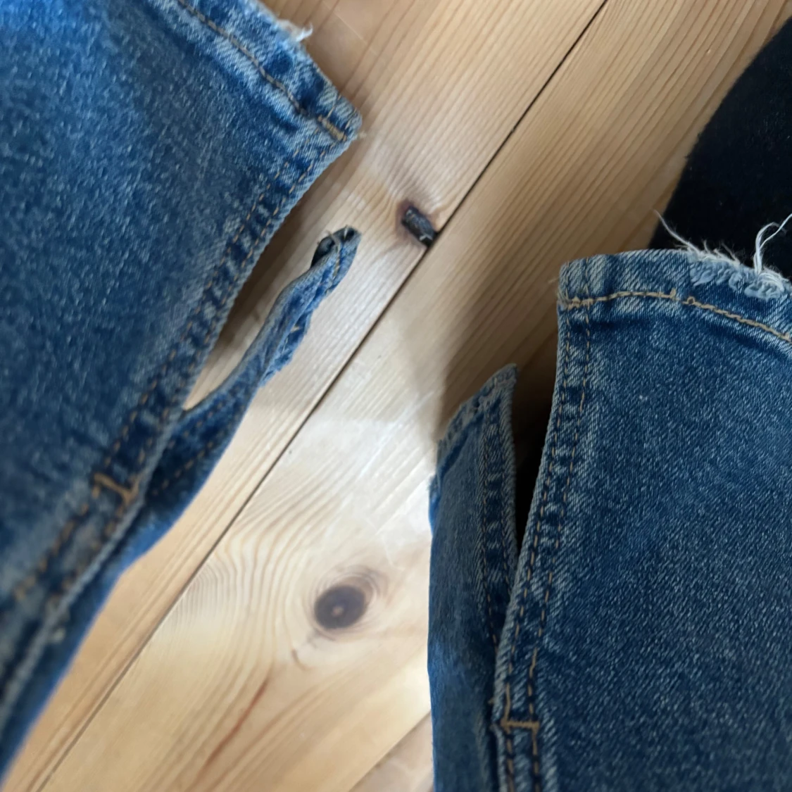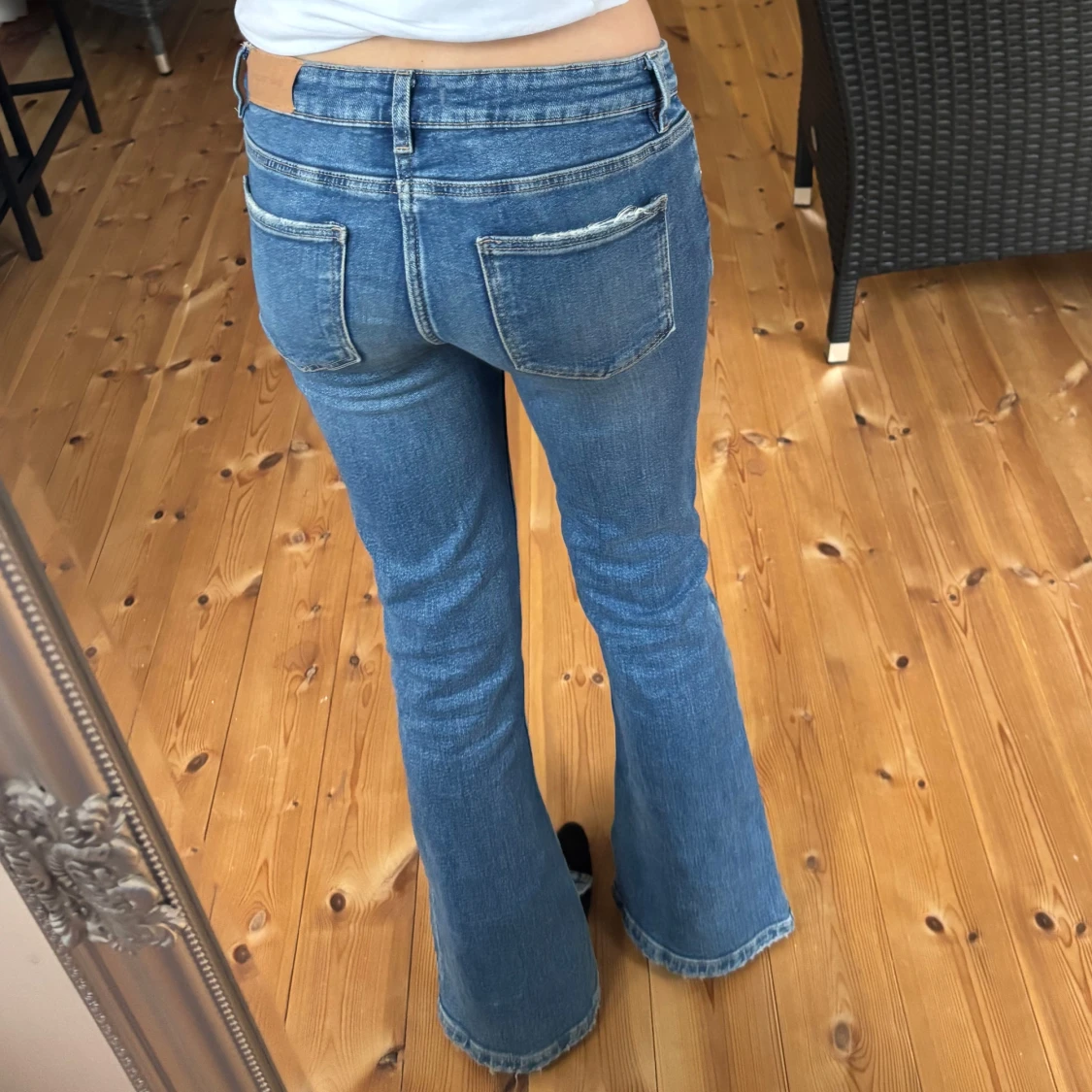 Snygga blå bootcut jeans med liten slit längst ner och fransade kanter. Jättefina men lite för små för mig, använt typ 5 gånger💕 Strl 152 men passar även 30-32 i längd💕