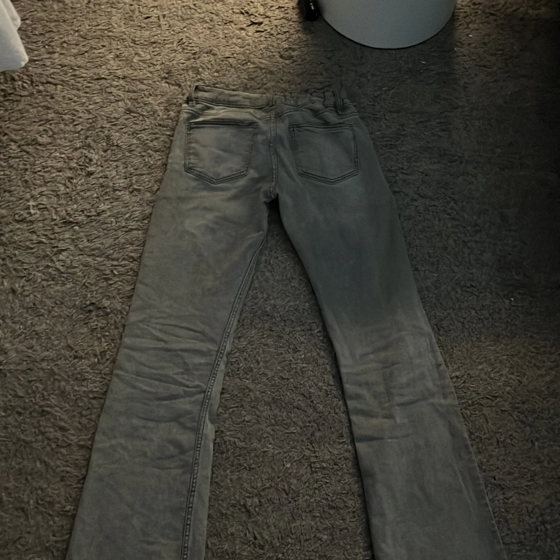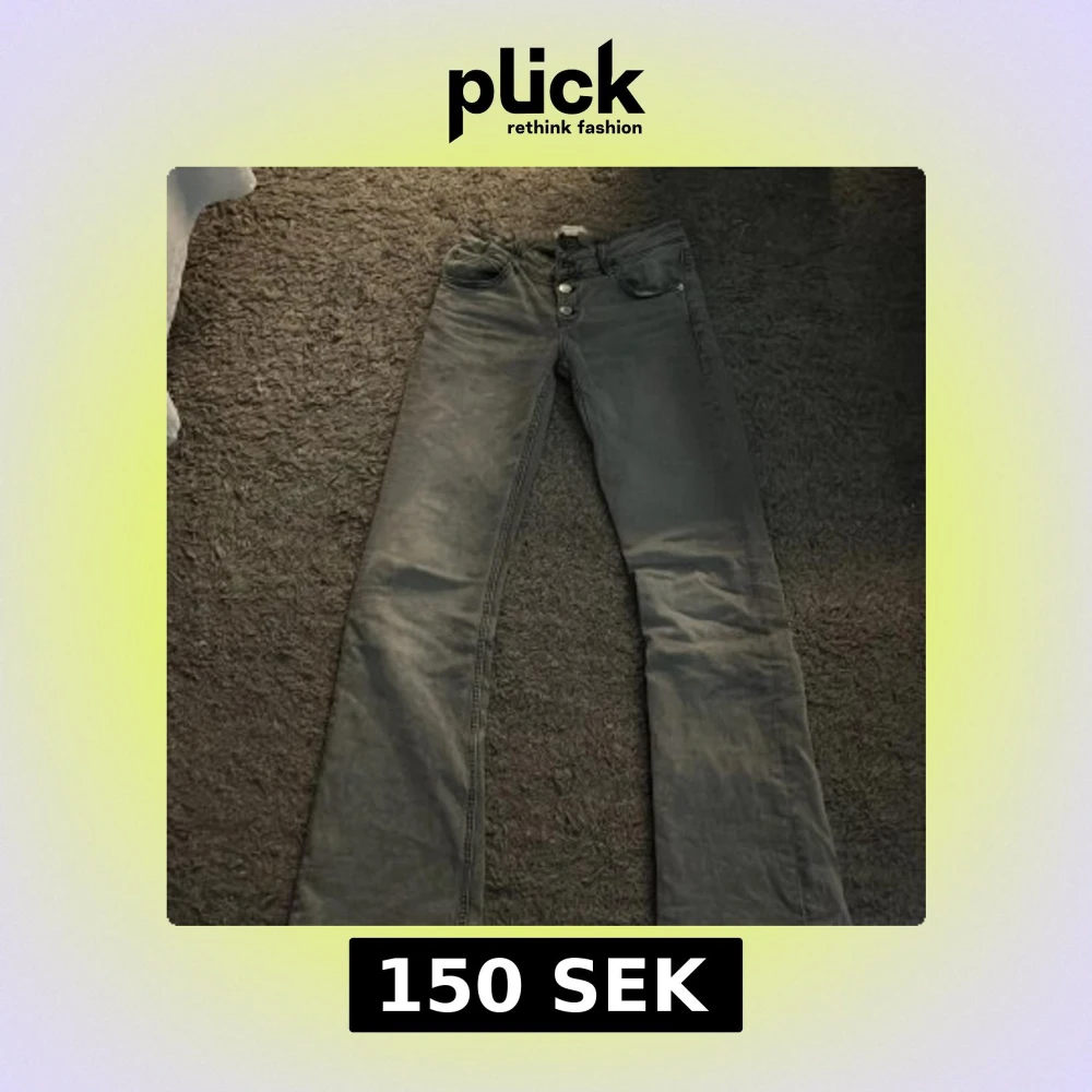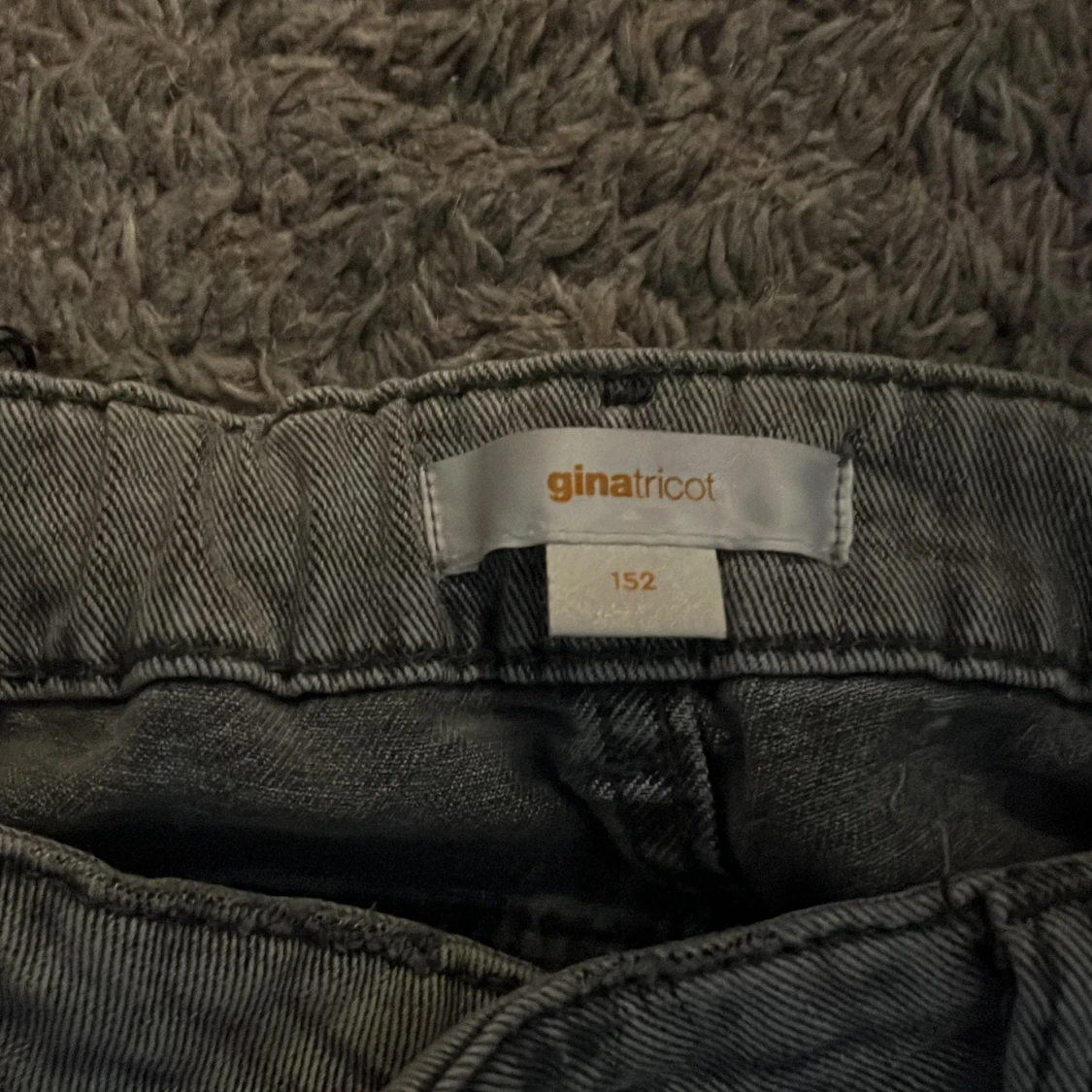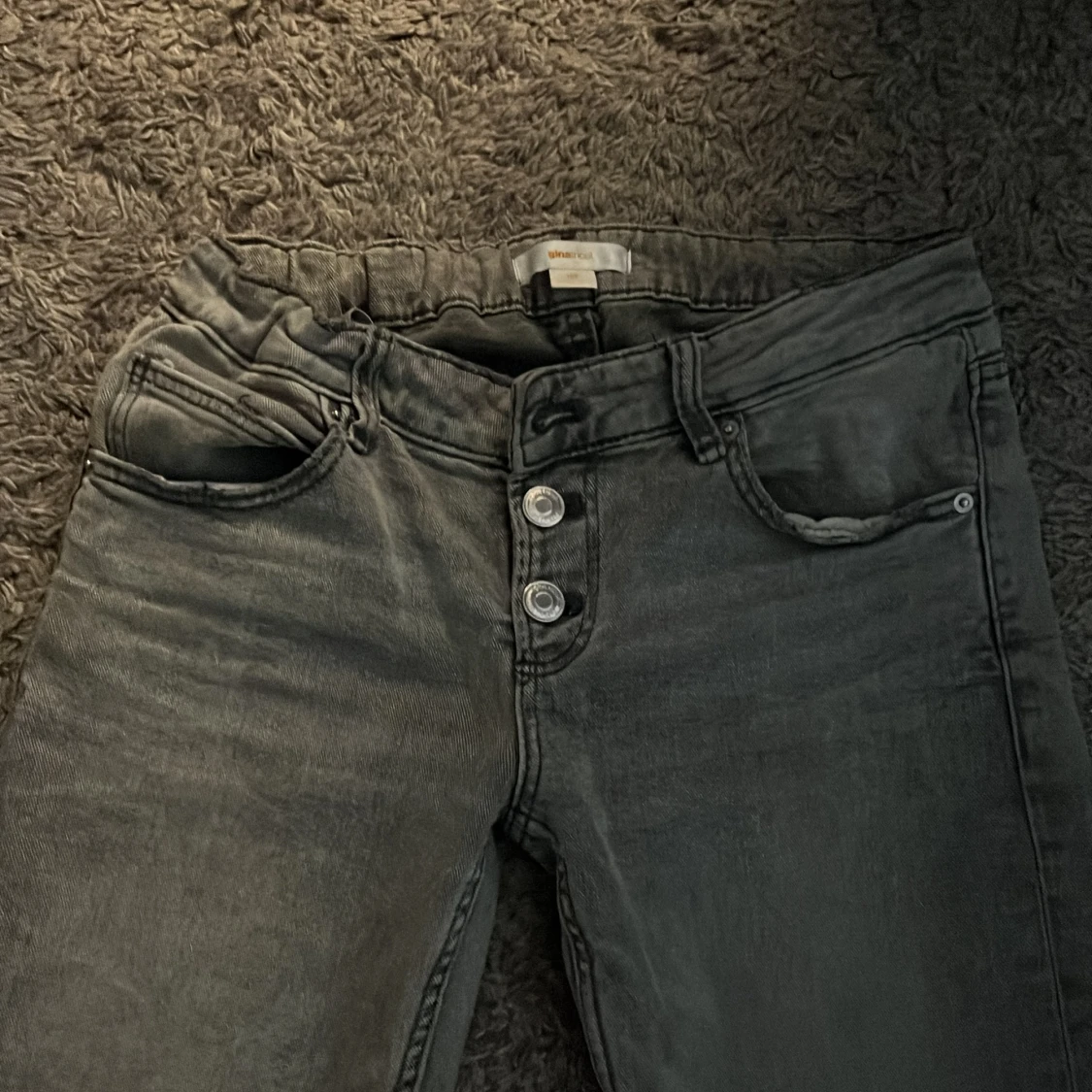 Snygga grå jeans från Gina Tricot med bootcut-stil och hög midja. Byxorna har en klassisk femficksdesign och stängs med tre knappar framtill. Perfekta för en avslappnad look.
