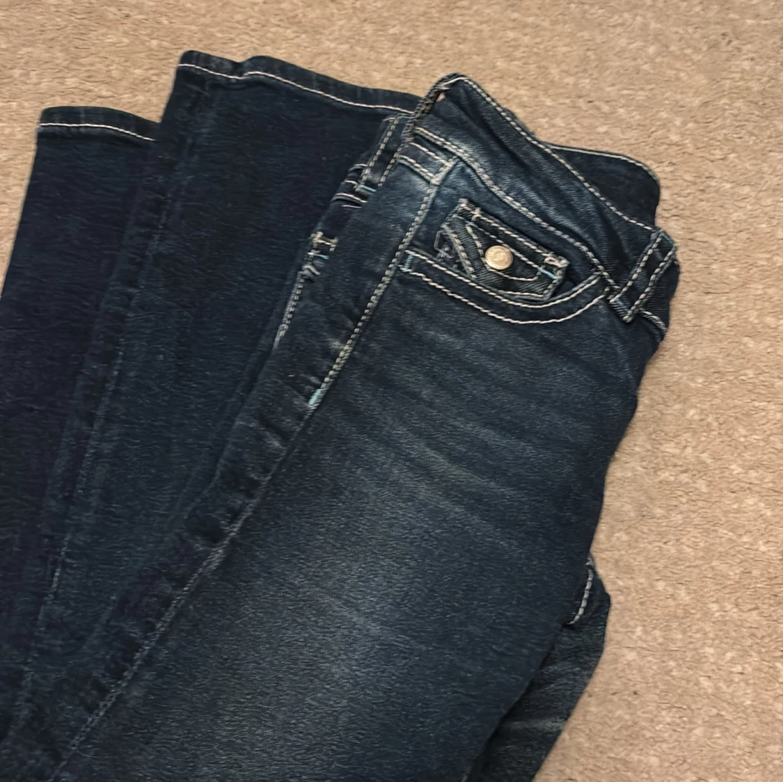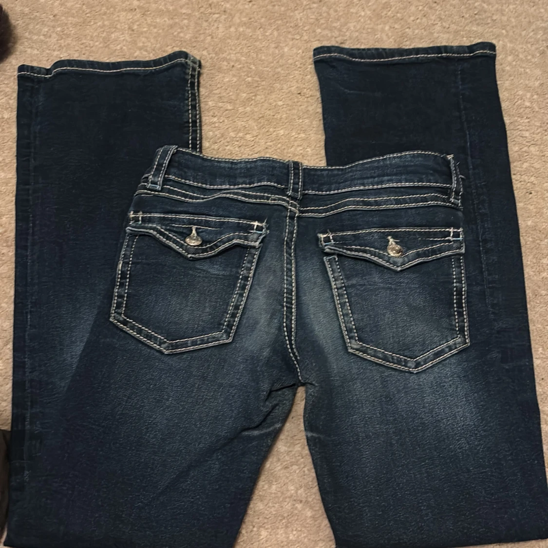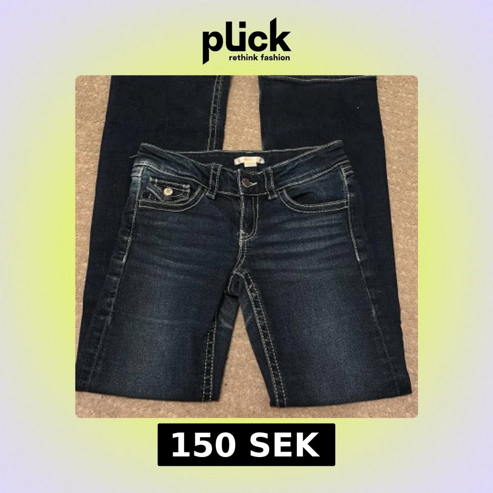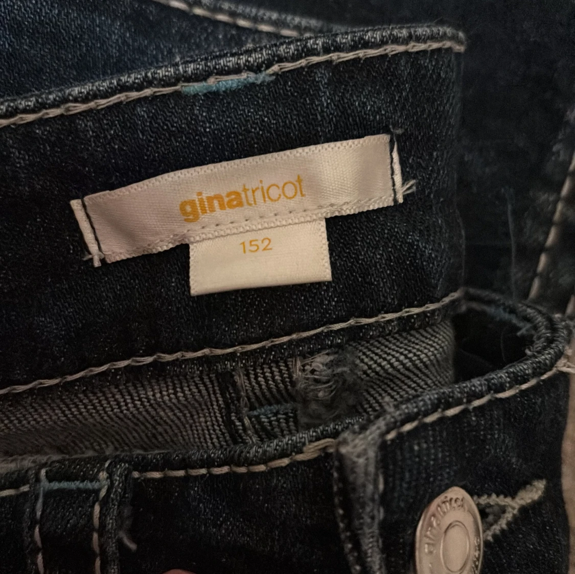 Snygga mörkblå jeans från Gina Tricot med kontrasterande sömmar och klassisk femficksdesign. Jeansen har en knapp och dragkedja framtill samt dekorativa bakfickor med knappar. Perfekta för en avslappnad stil.