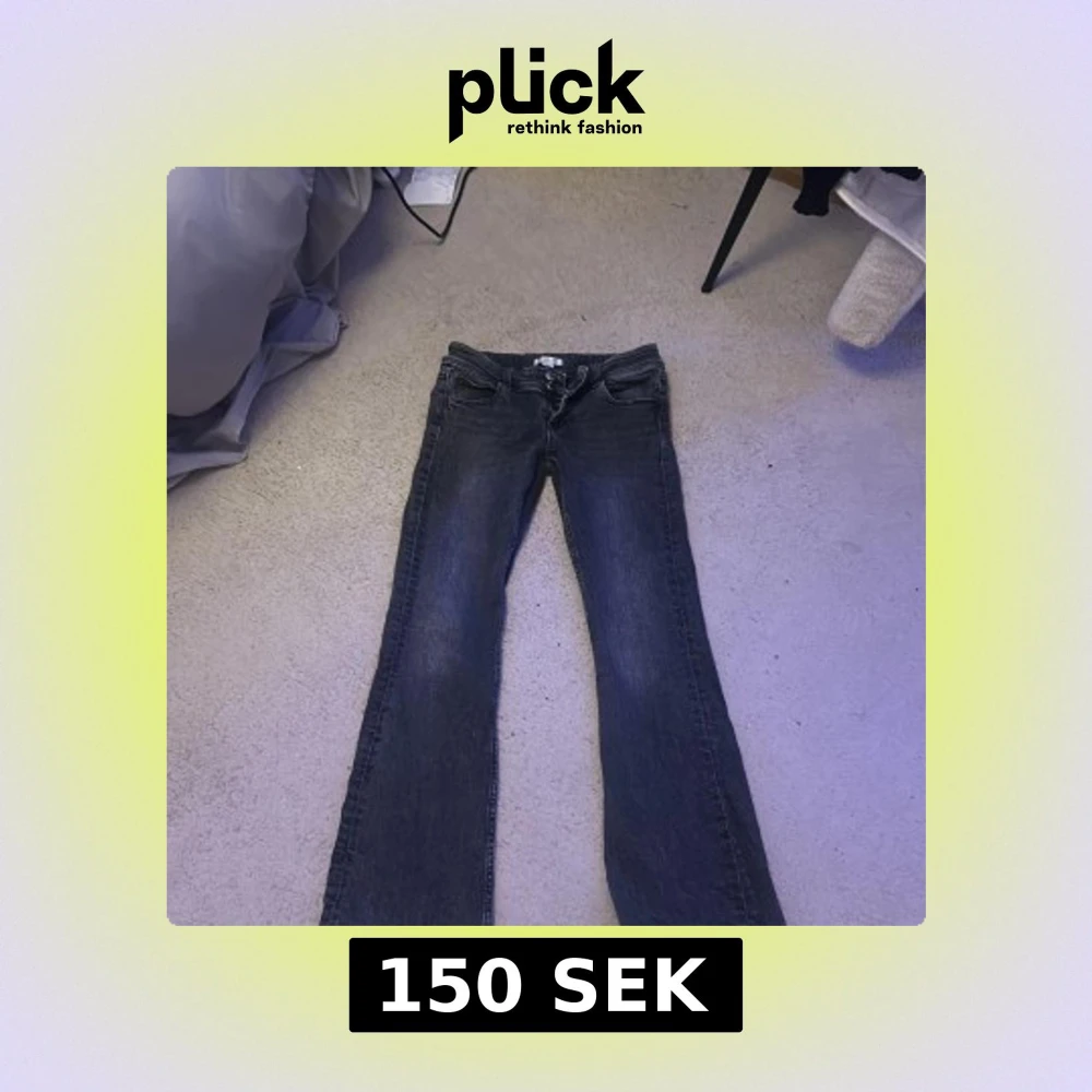 Snygga mörkgrå jeans från Gina Tricot i storlek 152. Modellen har bootcut-ben och klassisk femficksdesign med knappar framtill och fickor med lock bak. Jeansen är i ett stretchigt denimtyg som sitter skönt och ger en cool look.