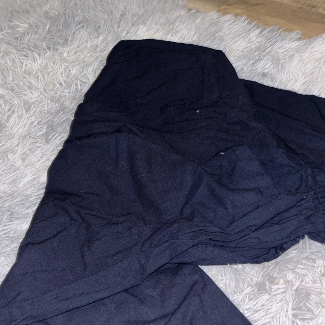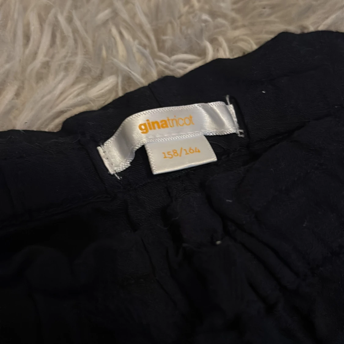 Marinblåa linnebyxor från Gina Tricot i storlek 158/164. De har en rak passform och är tillverkade i ett mjukt bomullsliknande material. Byxorna har resår i midjan och stora fickor framtill för en chill och enkel stil.