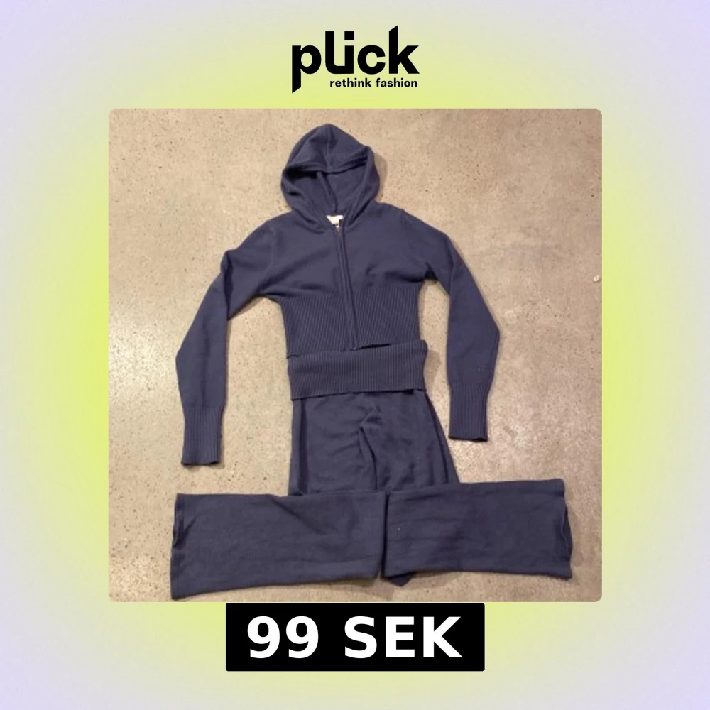 Ett fint soft knitted set i mörkblå från Gina tricot i storleken 158/164. Byxorna är stickade yoga pants de är använda men inget man tänker på och tröja är en kortare zip hoodie som är ribbad på magen och ändarna av armarna.