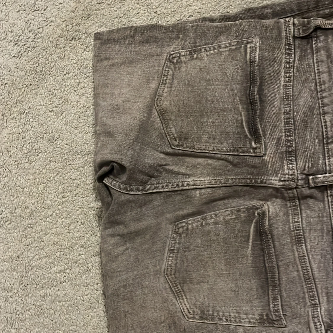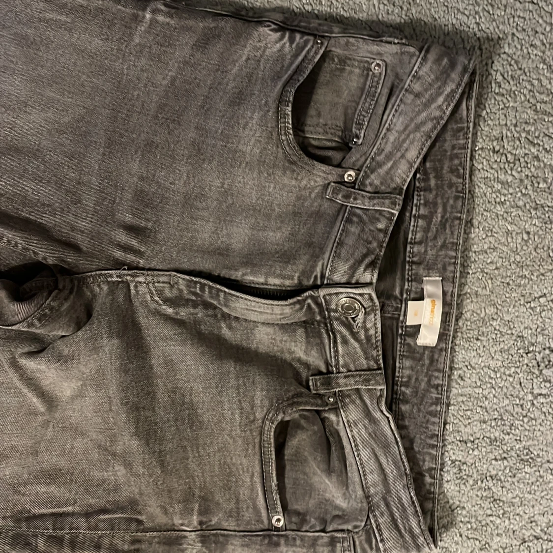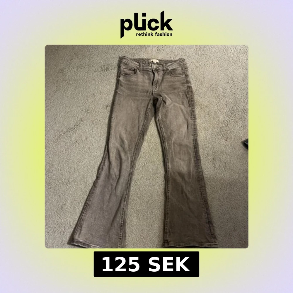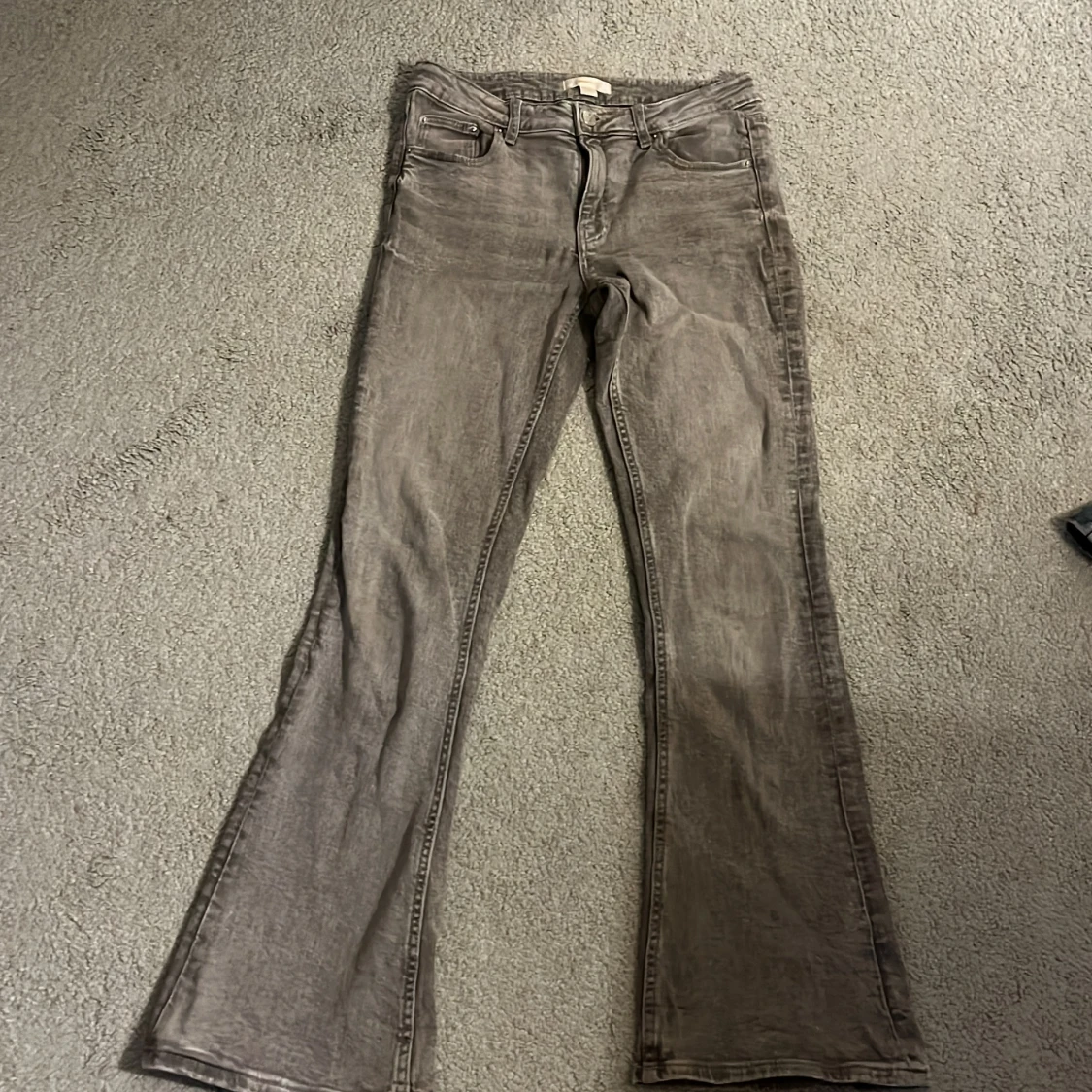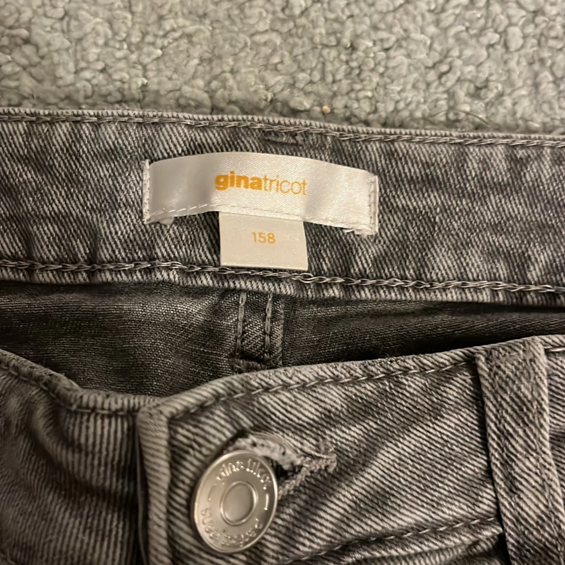 Snygga grå jeans från Gina Tricot i storlek 158. Modellen har bootcut-ben, klassiska fem fickor och dragkedja med knapp framtill. Jeansen har en tvättad look och är tillverkade i ett mjukt bomullsmaterial med lite stretch.