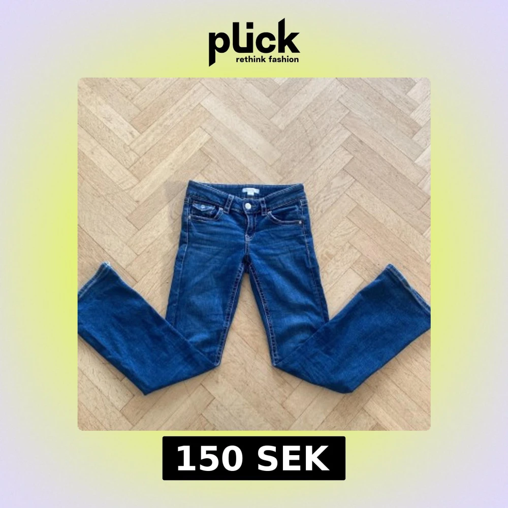 Snygga blå jeans från Gina Tricot med klassisk femficksdesign och knappgylf. Dom är bootcut och lågmidjade. Storlek 158.