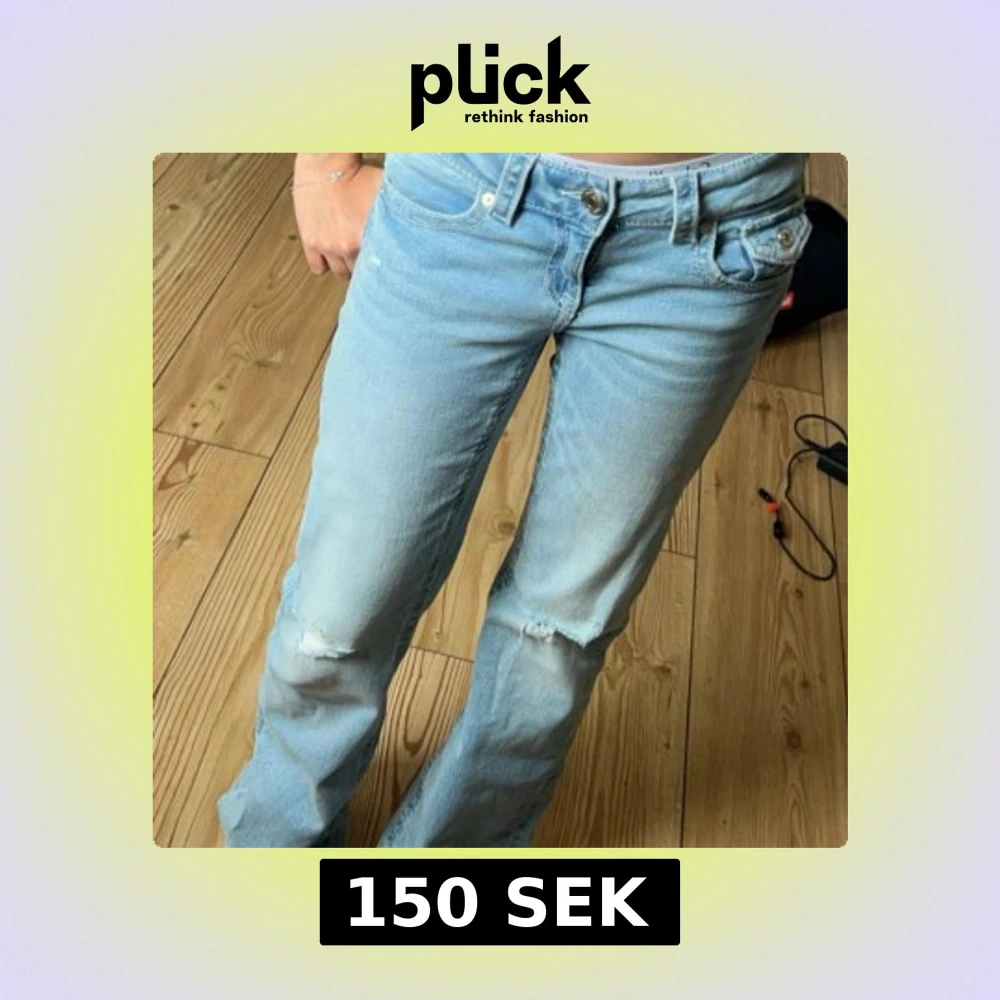 Säljer ett par ljusblå jeans med raka ben och snygga slitningar på knäna. Jeansen har klassisk femficksdesign, låg midja och är tillverkade i mjukt denimtyg. Perfekta för en avslappnad och trendig look.