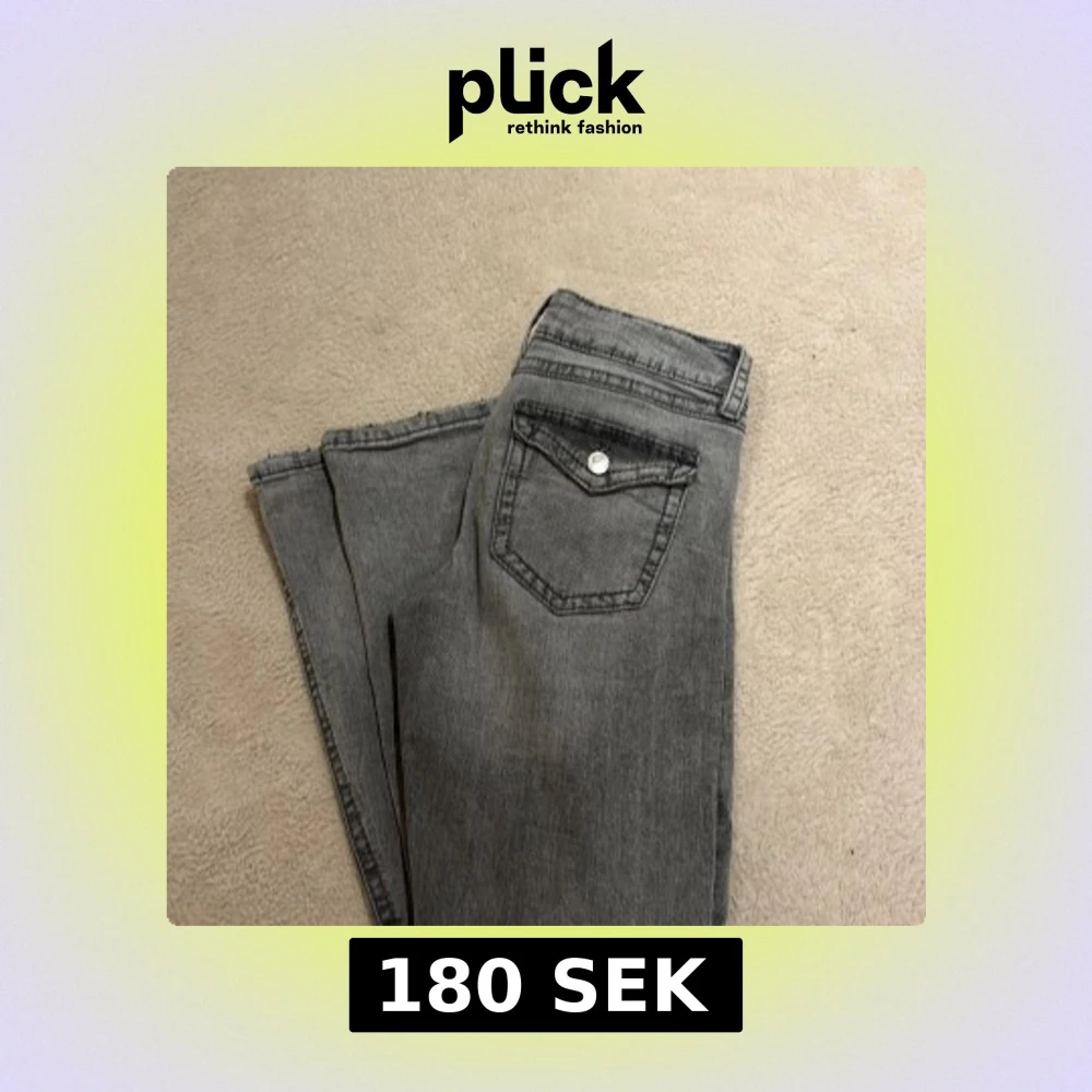 Snygga grå jeans från Gina Tricot med bootcut-modell och klassisk femficksdesign. Jeansen har en låg midja, silverfärgade knappar och dragkedja. Perfekta för dig som gillar en avslappnad men trendig look.