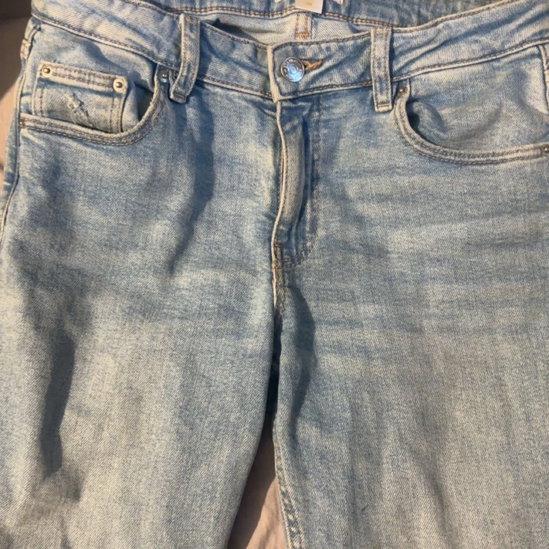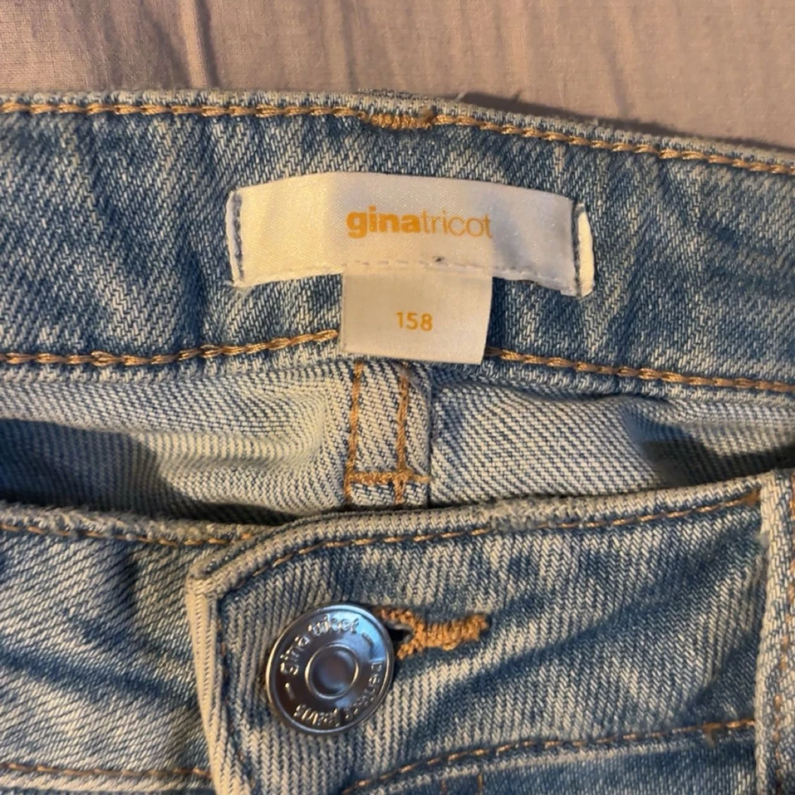 Säljer ett par ljusblå jeans från Gina Tricot i storlek 158. Klassisk med normal passform och låg midja. Jeansen har snygga slitningar och är perfekta till en avslappnad look.