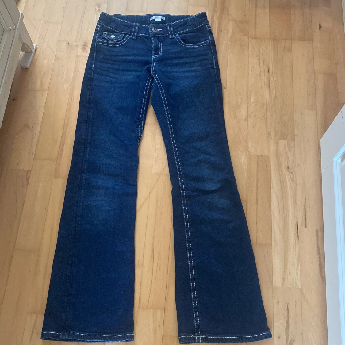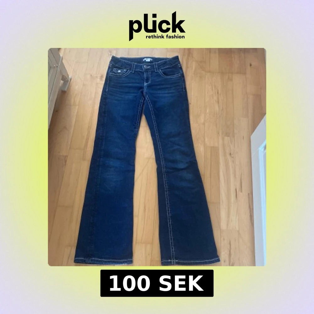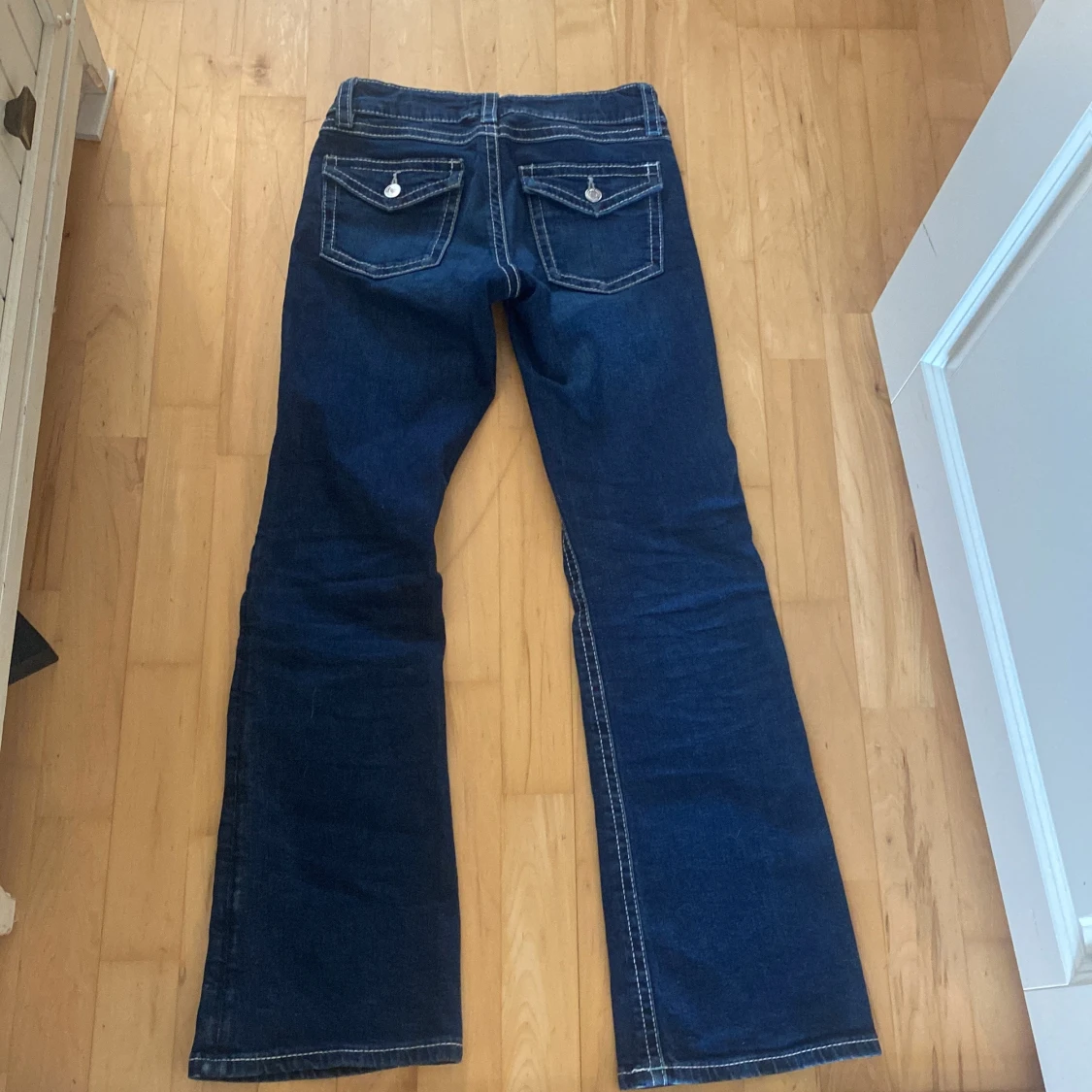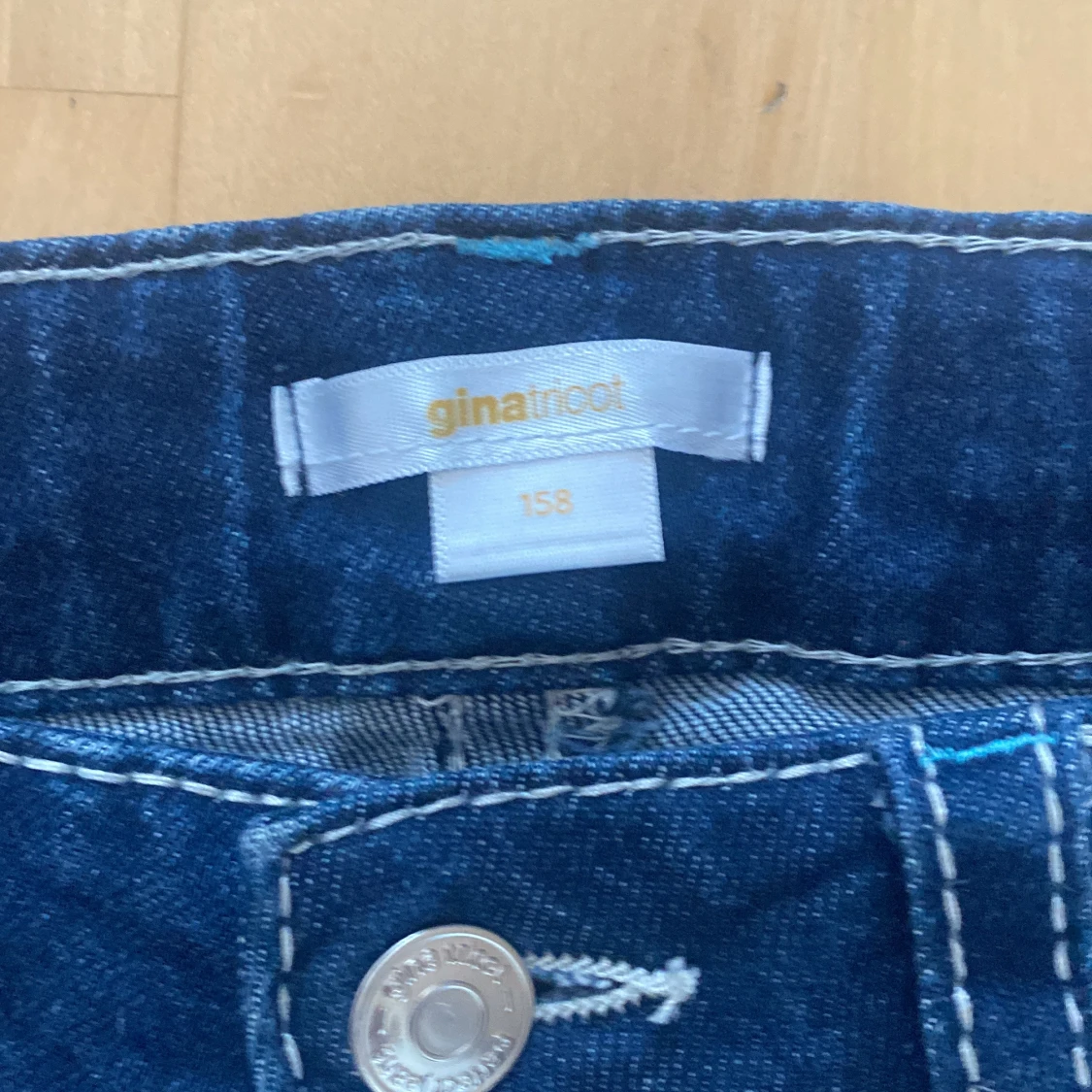 Snygga mörkblå jeans från Gina Tricot i storlek 158. Modellen har bootcut-ben, klassiska fem fickor och kontrastsömmar. Jeansen är tillverkade i jeansmaterial och har knappar både fram och på bakfickorna för extra detaljer.