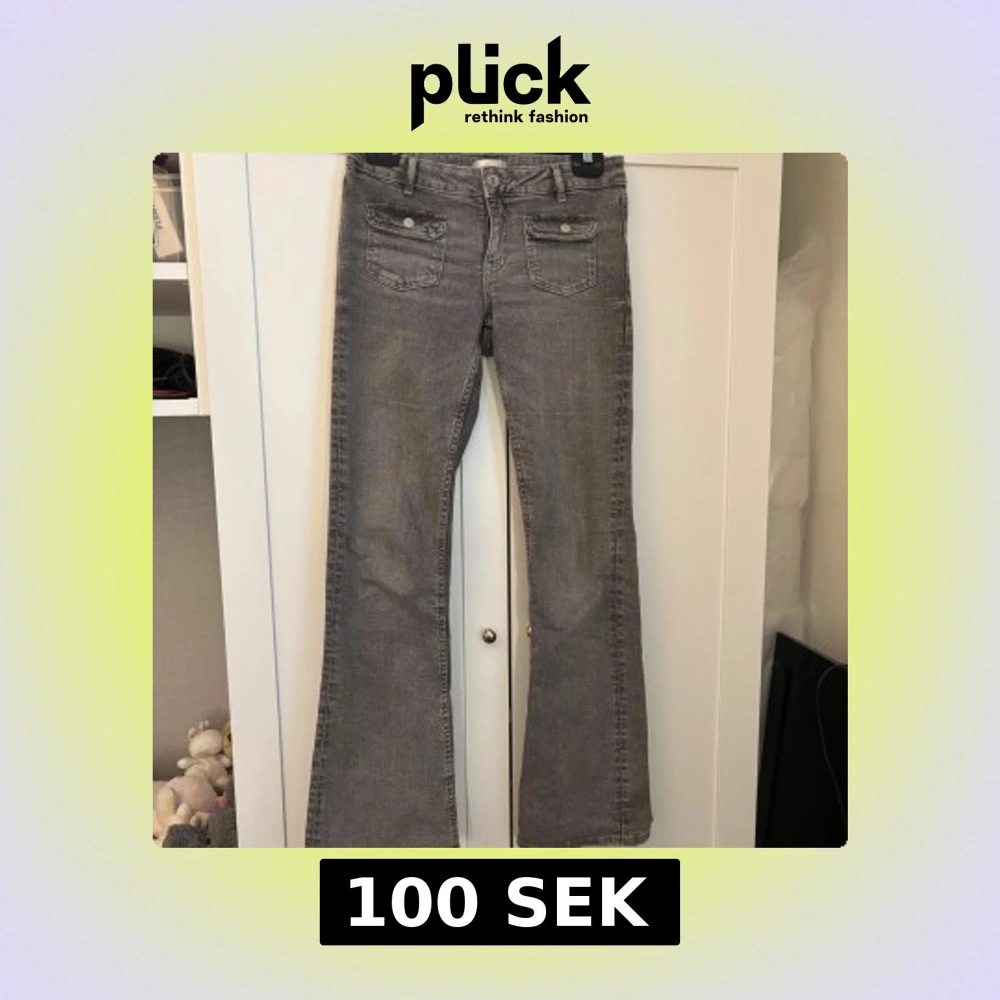 Snygga grå jeans från Gina Tricot med bootcut-modell. Byxorna har framfickor med lock och knapp, samt klassiska bakfickor. Perfekta för dig som gillar en lite utsvängd stil