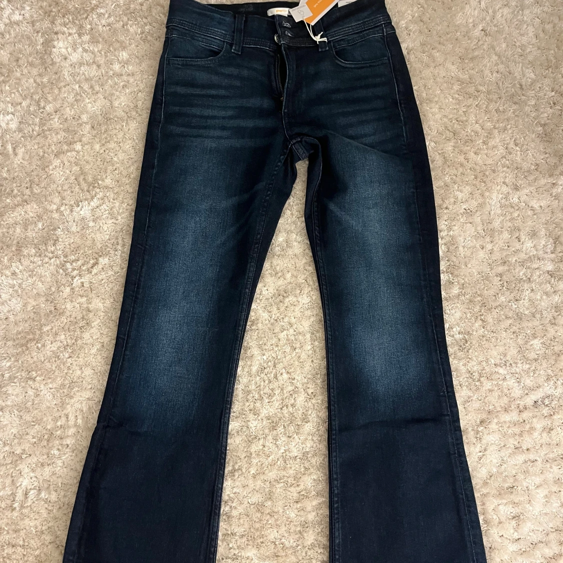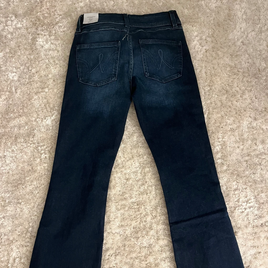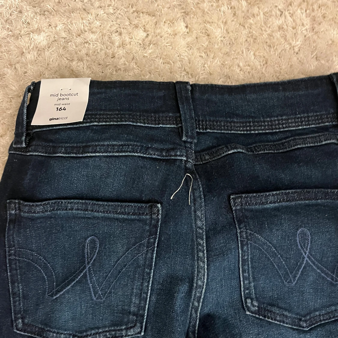 Snygga mörkblå bootcut jeans från Gina Tricot i storlek 164. Modellen har midwaist och klassisk femficksdesign med broderade bakfickor. Jeansen är tillverkade i stretchigt denim för skön passform och har en stilren look som funkar till allt. Passar mig som bär XS, aldrig använda! Helt nya med prislapp .