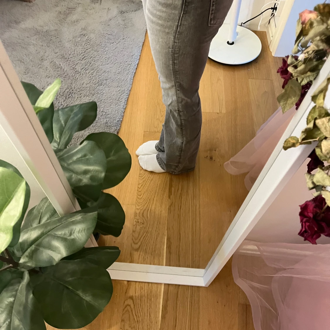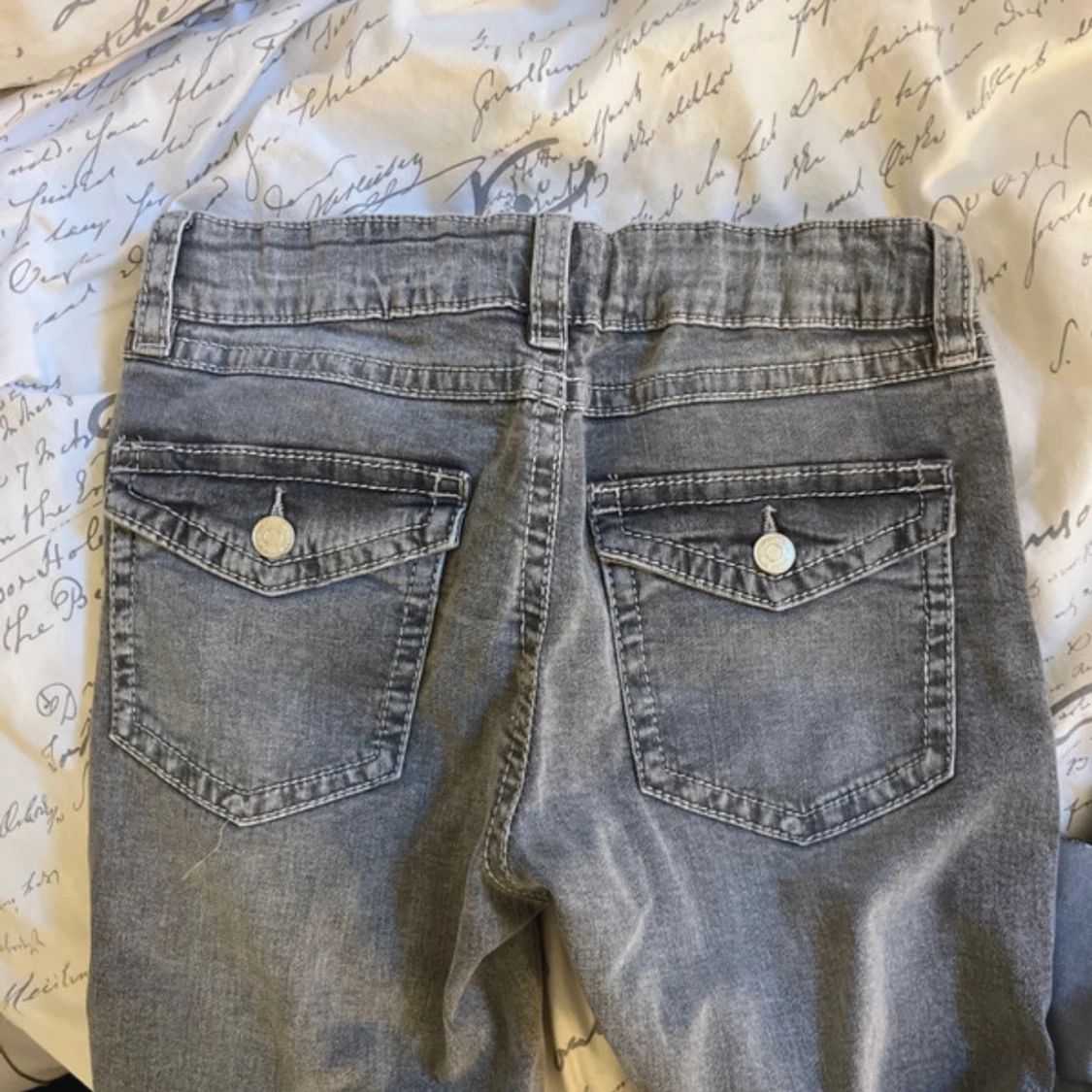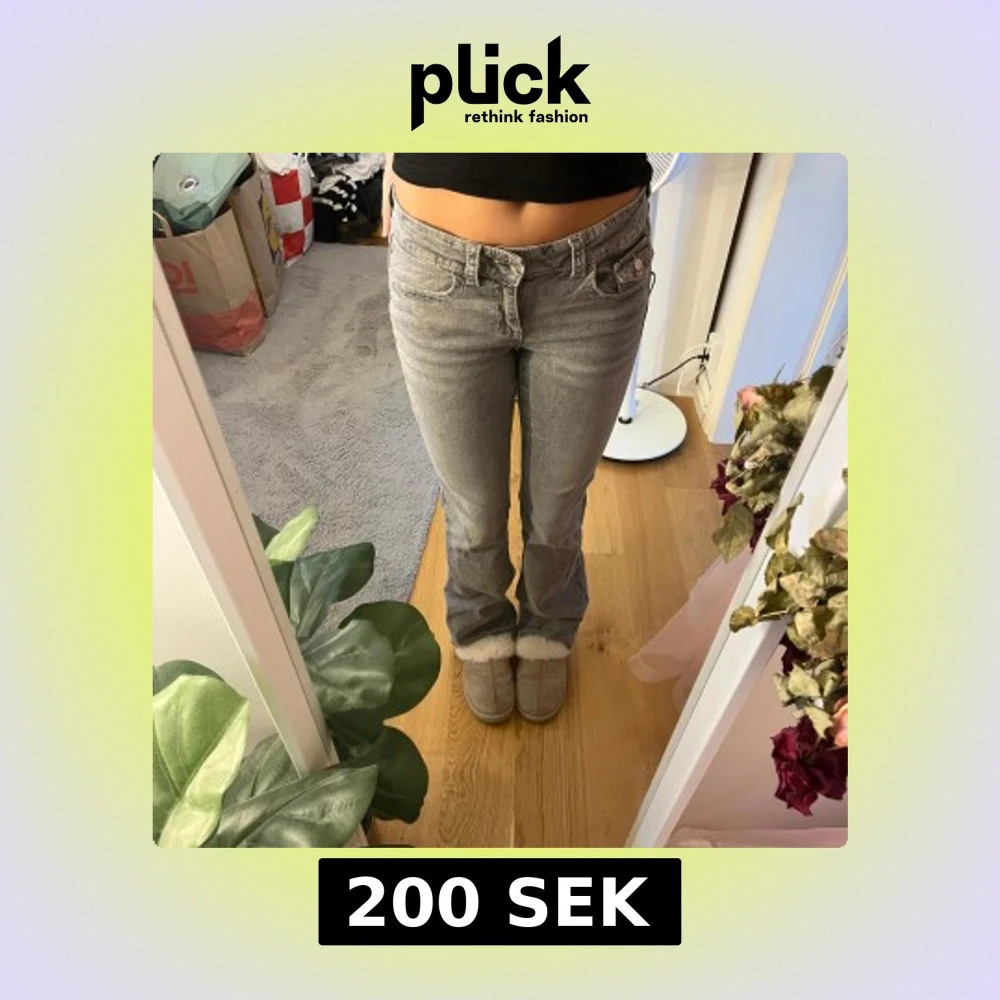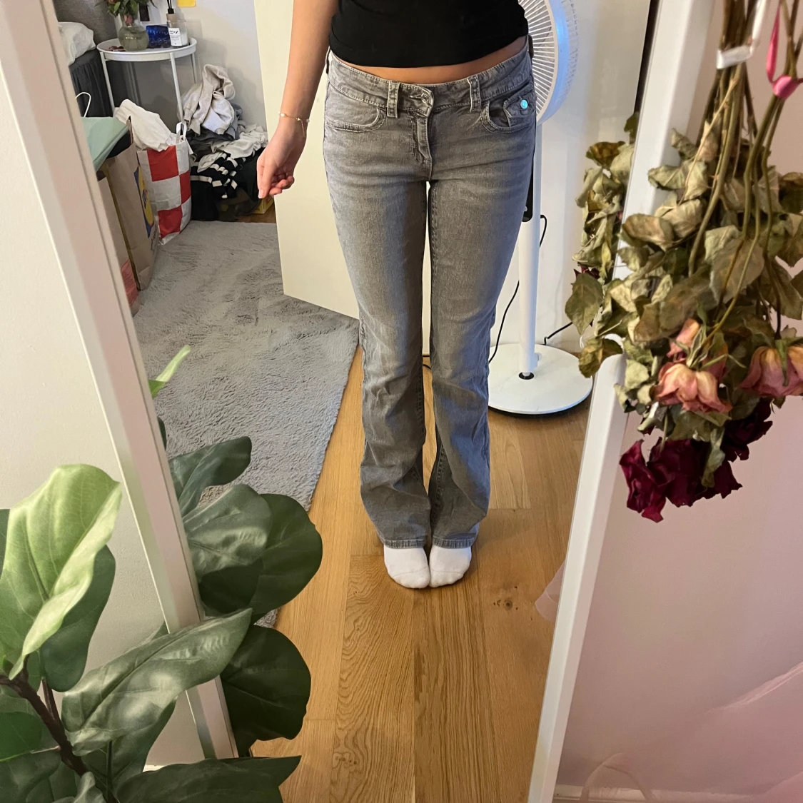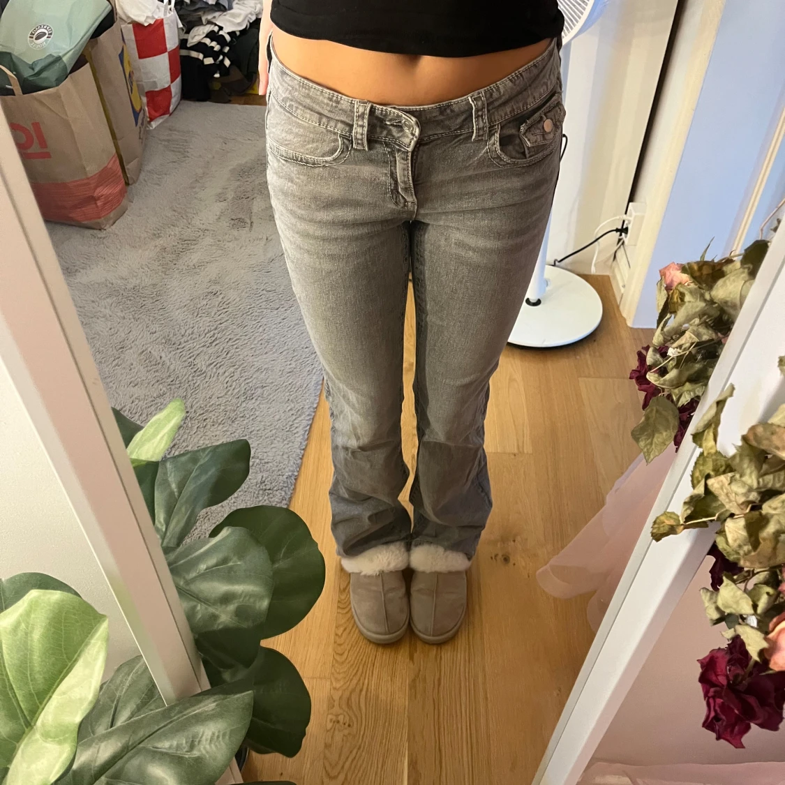 Säljer ett par gråa jeans med bootcut-modell och låg midja. Jeansen har snygga bakfickor med lock och knapp, samt klassisk femficksdesign. Materialet är denim och färgen är en tvättad grå nyans som ger en cool vibe.