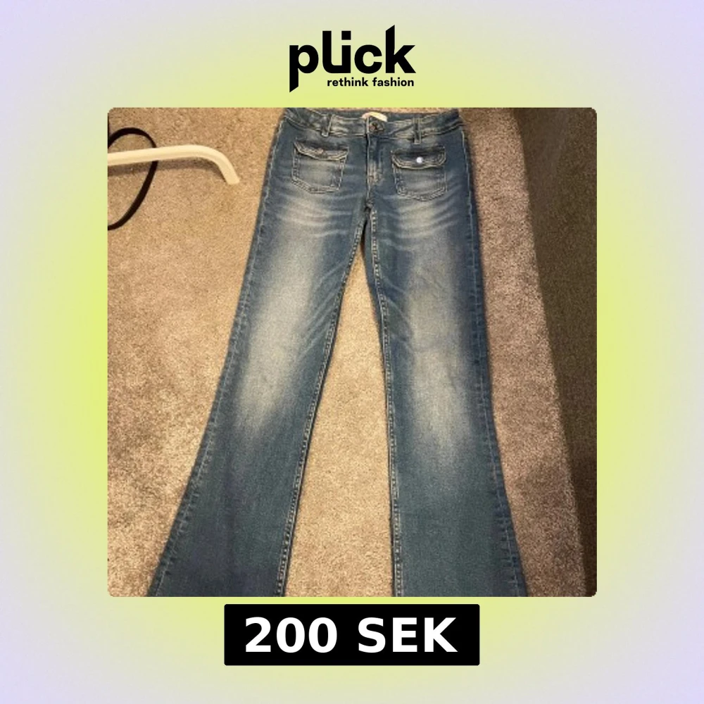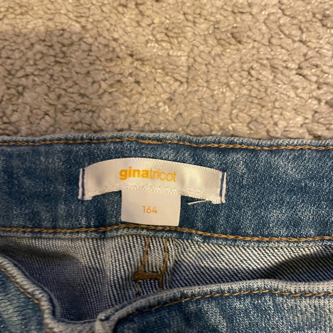Snygga blå jeans från Gina Tricot med frickor fram, strl 164💞De är i nyskick och använda fåtal gånger. Tror inte de säljs längre men de är köpta för 399 kr💕