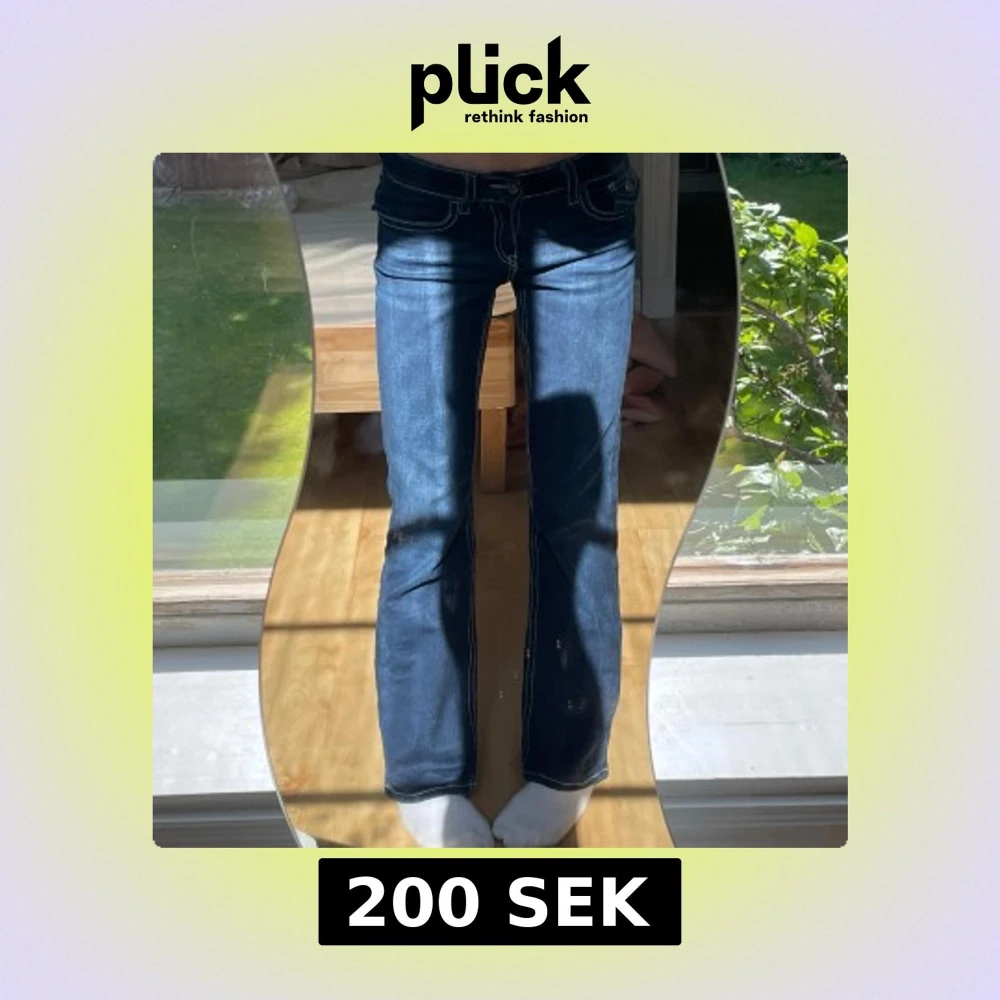 Säljer ett par mörkblå bootcut jeans från Gina Tricot med snygga kontrastsömmar och coola fickdetaljer bak. Jeansen har låg midja och är tillverkade i klassiskt denimtyg. Perfekta för dig som gillar en retro vibe och vill ha ett par jeans som sticker ut.