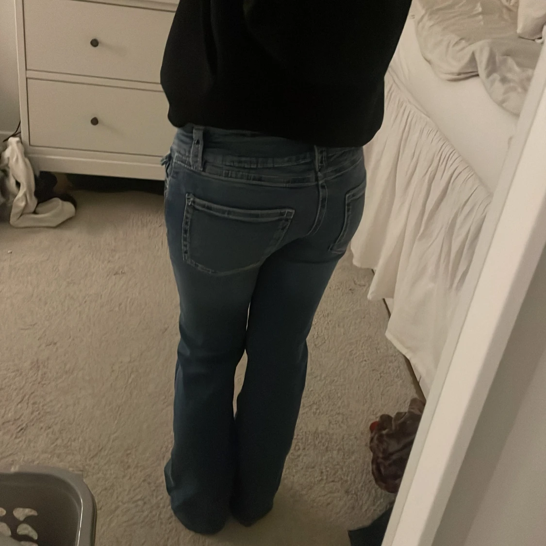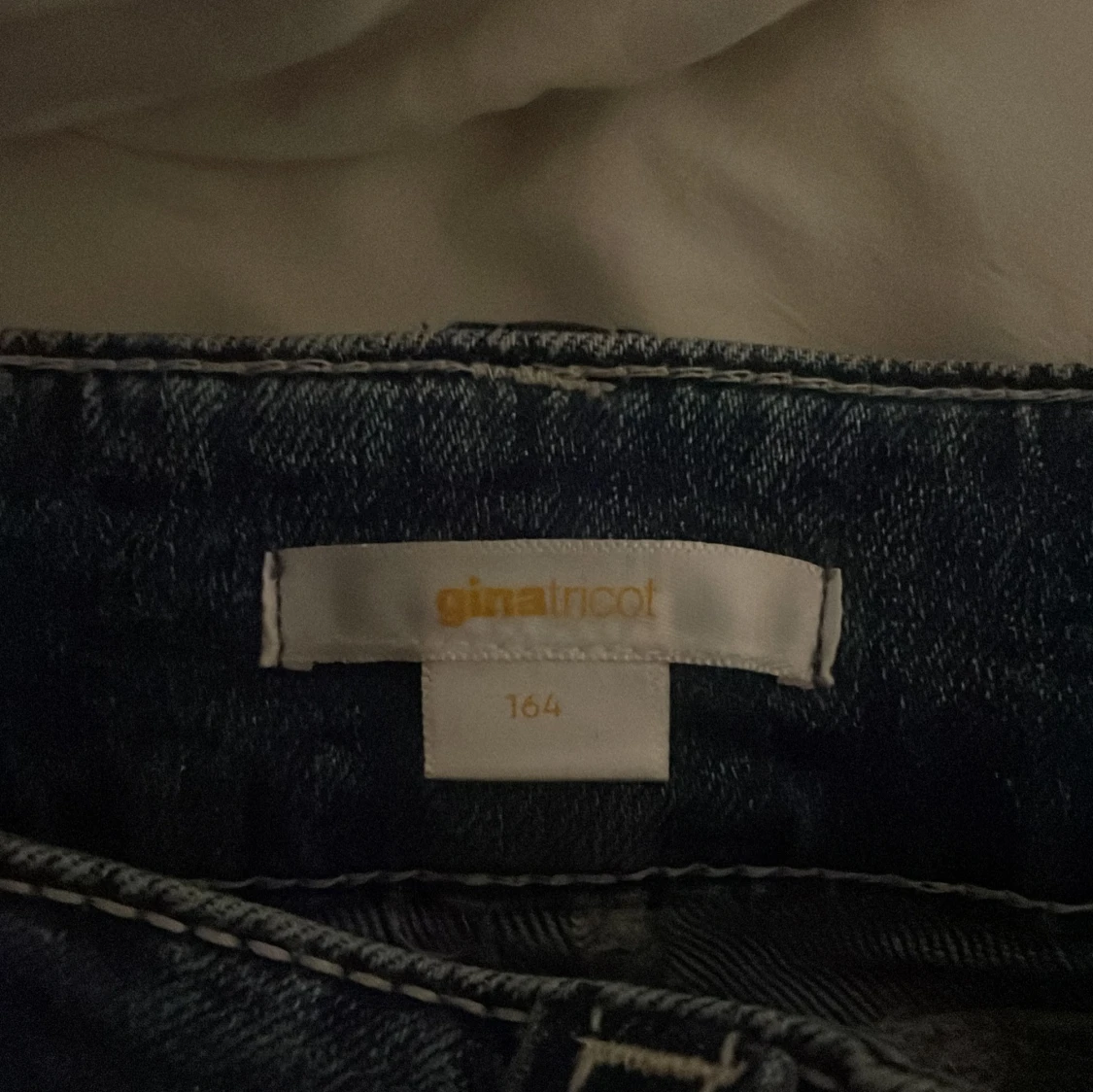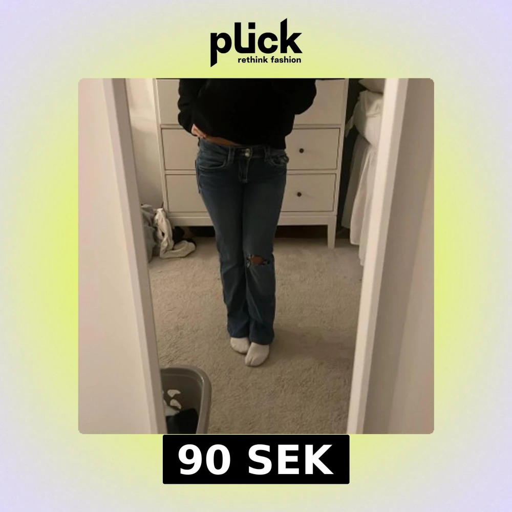 Säljer ett par blå jeans från Gina Tricot i storlek 164. Modellen har bootcut-ben och låg midja, med klassiska fickor och egenklippt hål i knät💗