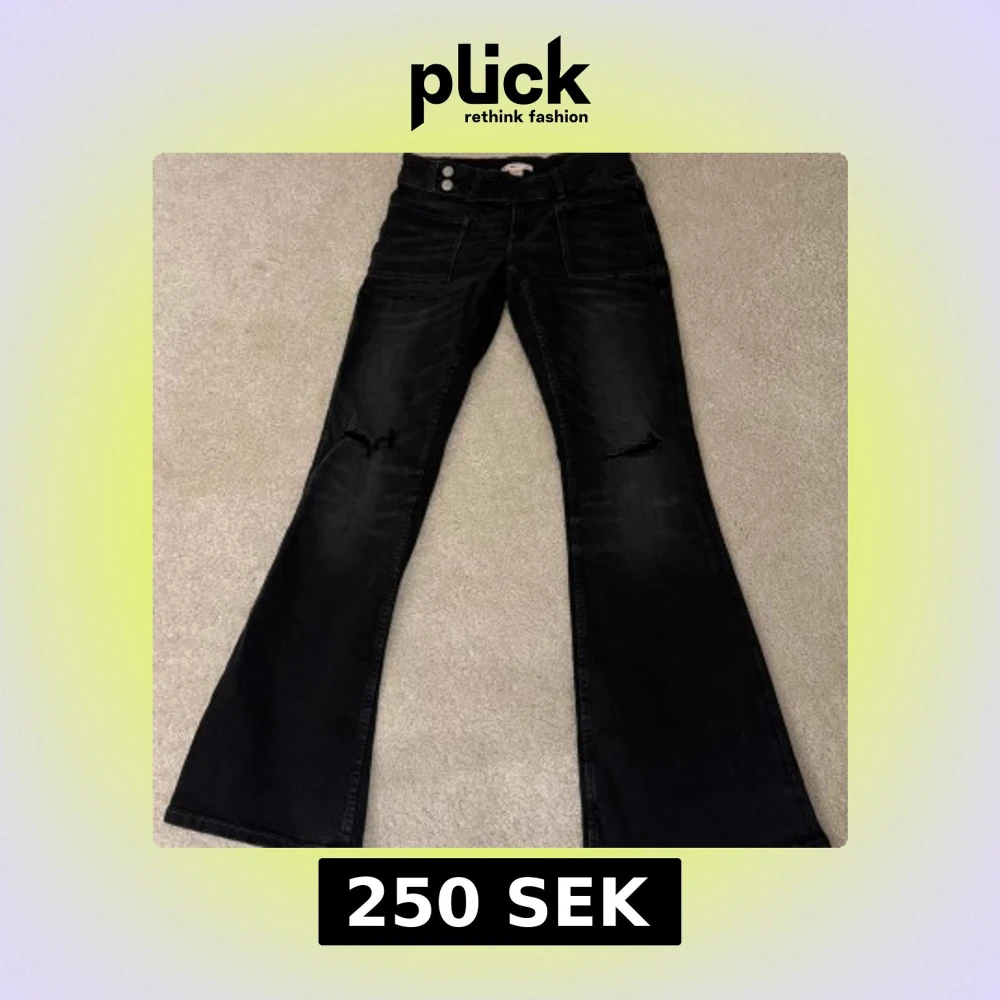 Svarta jeans från Gina Tricot i storlek 164 med bootcut-ben och slitna detaljer vid knäna. Jeansen har framfickor, dubbla knappar i midjan och klassisk femficksdesign. Perfekta för dig som gillar en trendig och avslappnad look. Dessa är också oanvända därför priset och har aldrig använt dem!